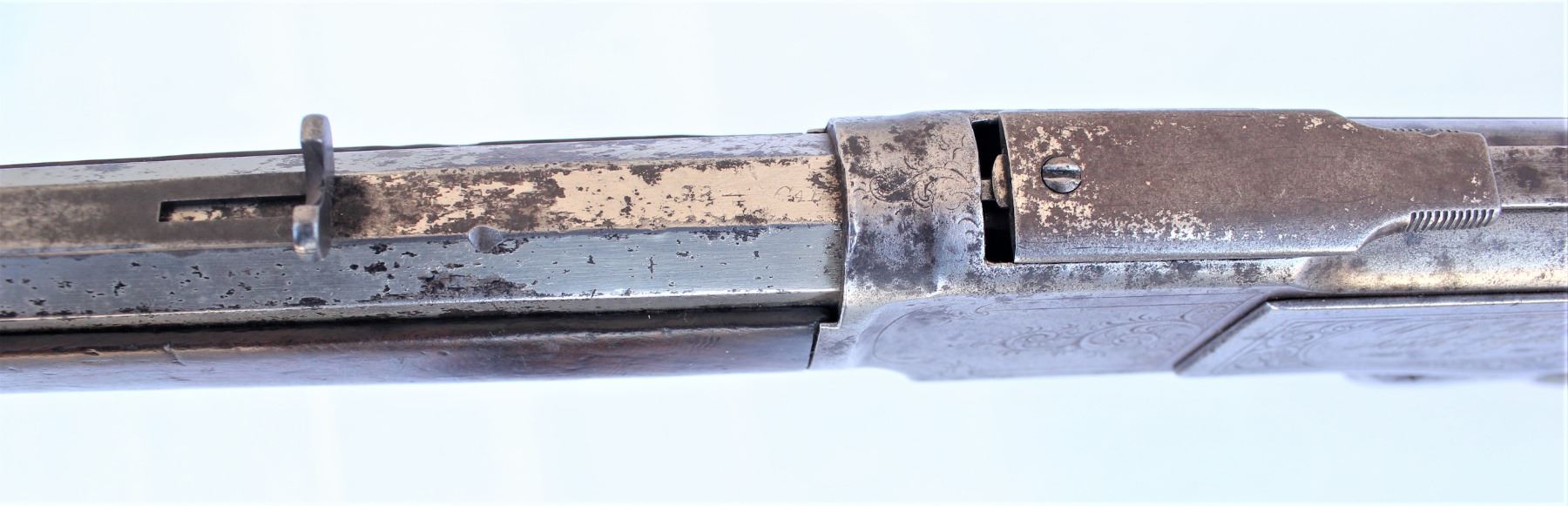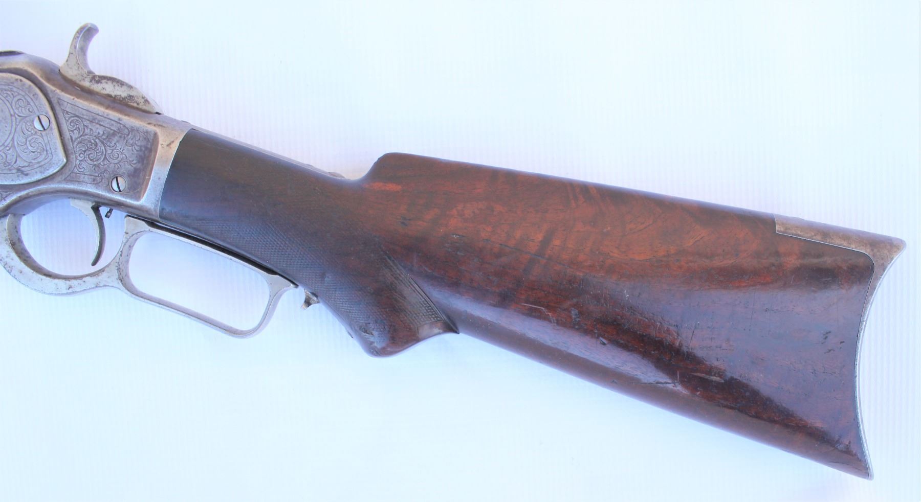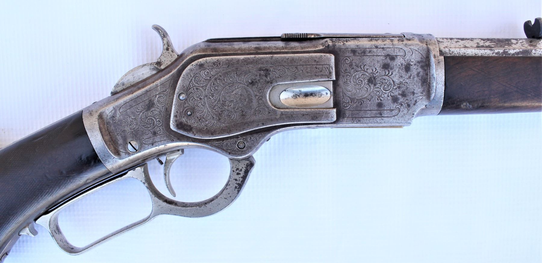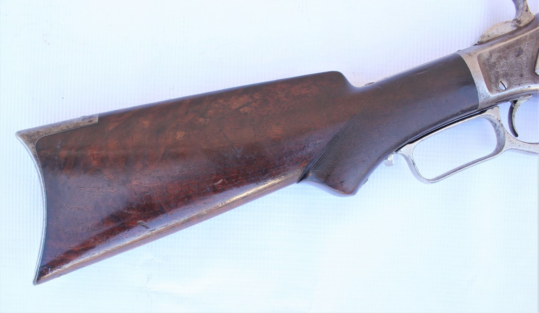 A phenominal piece of Wild West Show history, this Winchester 1873 deluxe rifle belonged to the well known sharp shooter that was a decorated US Cavalry soldier and then later toured with Buffalo Bills Wild West Show. W.H. Tucker's photograph is found at the lower left of the 1885 show poster where he is known as "Ogallala Tucker". As the rifle is presentation engraved "W.H. Tucker North Platte, Neb.", which is where Tucker lived, and Ogallala is a nearby town. The rifle comes with documents of Tucker's life and also information of how the rifle has been passed along, which includes a 1972 Winchester Museum build sheet that states its history back to 1934 and that it was currently in the collection of DW Roberts. It is notated with statistics on the build sheet just how rare this rifle is, being 1 of 700 engraved, 1 of 600 plated, and 1 of 260 with a name. It is also an oddity in the way that this rifle may be one of the very first 32 calibers, as serial #138,000 is barely inside the 3rd model range and there were only 44-40 calibers available in second model, making it even more special. W.H. Tucker is extensively talked about in the well known book "Buffalo Bill: His Family, Friends, Fame, Failures, and Fortunes", by Nellie Yost, where she notes that he was the owner of the most prominant saloon in town, and other great details, as Buffalo Bill also had a magnificent ranch in North Platte. Also accompanied by a 2003 Winchester letter where it is documented in the Cody Museum records as being ordered with a $2.50 factory engraved reciever with engraved name on sideplate, nickel finish and gilt (gold) trim, chambered in 32 caliber, octagon barrel, set trigger and checkered fancy stock with pistol grip. The rifle shows wonderful honest condition with much of its original nickel and beautiful engraving.