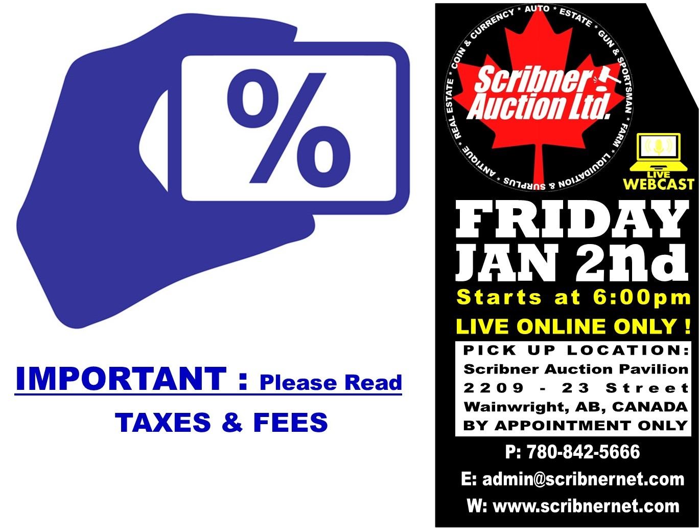 THURSDAY - FRIDAY - SATURDAY - SUNDAY : Purchases will be packaged up after the auction and shipped via Canada Post or PUROLATOR (please let us know which of those 2 Couriers you prefer) within 12-16 days of the auction sale. IF CANADA POST IS ON STRIKE we will be using Purolator. Purolator has offered us great rates competitive with Canada Post in some cases even better depending on location.Please contact us via email (reception.scribnerauction@gmail.com) or call 780-842-5666 prior to the auction if you wish to arrange alternate shipping. Shipping & Handling Charges will be charged to your credit card at the time of shipping. Most packages shipped via Canada Post come with $100 insurance. Please review Canada Post Terms & Conditions & Purolator Terms & Conditions for their respective Insurance Policies. If you want EXTRA Insurance from the carrier, you must instruct our office to purchase additional insurance! Scribner Auction Ltd. will not be responsible for any damage or breakage to any item for any reason (shipping, handling or otherwise). If you wish to arrange for Pick Up at our Wainwright, AB location, please call our office to make an appointment 780-842-5666. You MUST schedule an appointment (NO DROP INS PLEASE!)