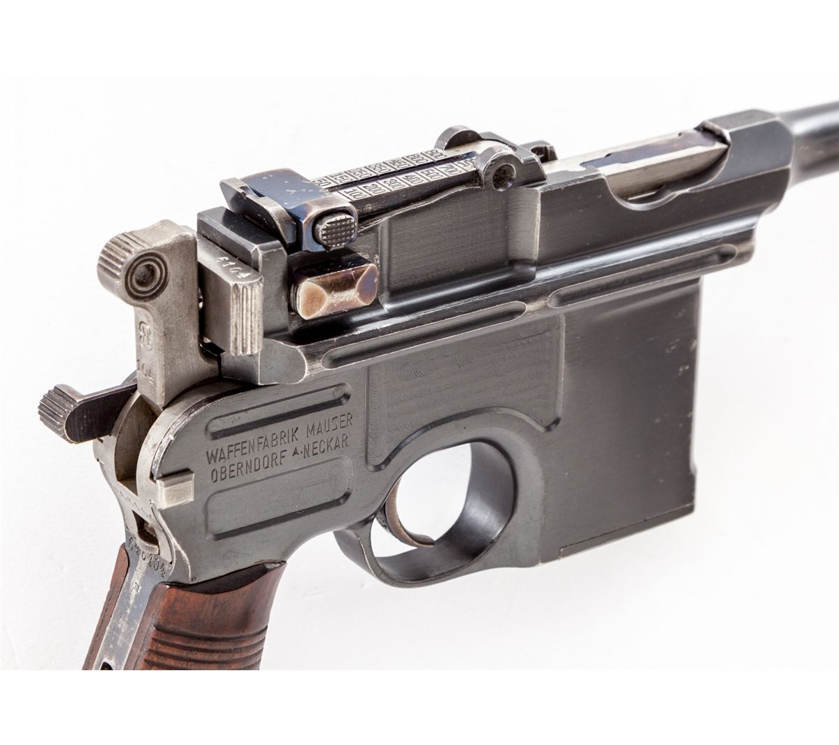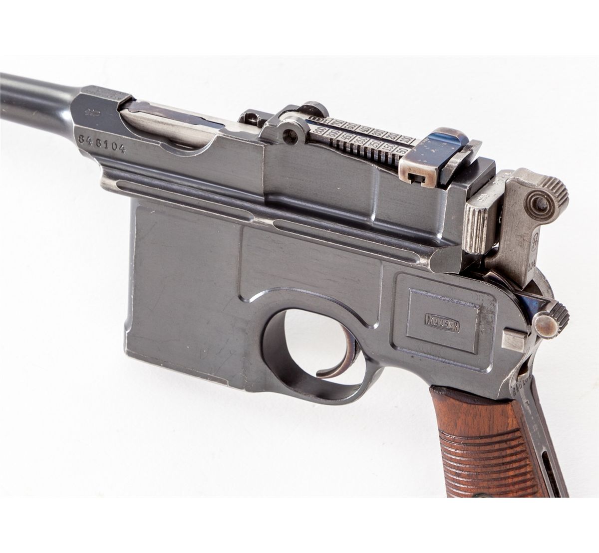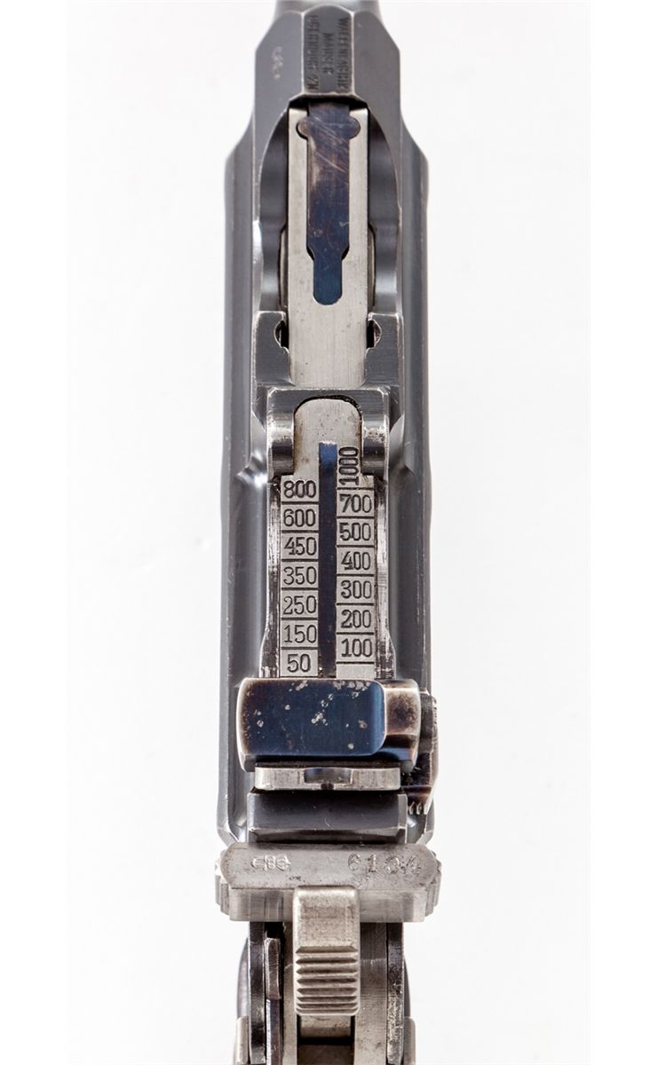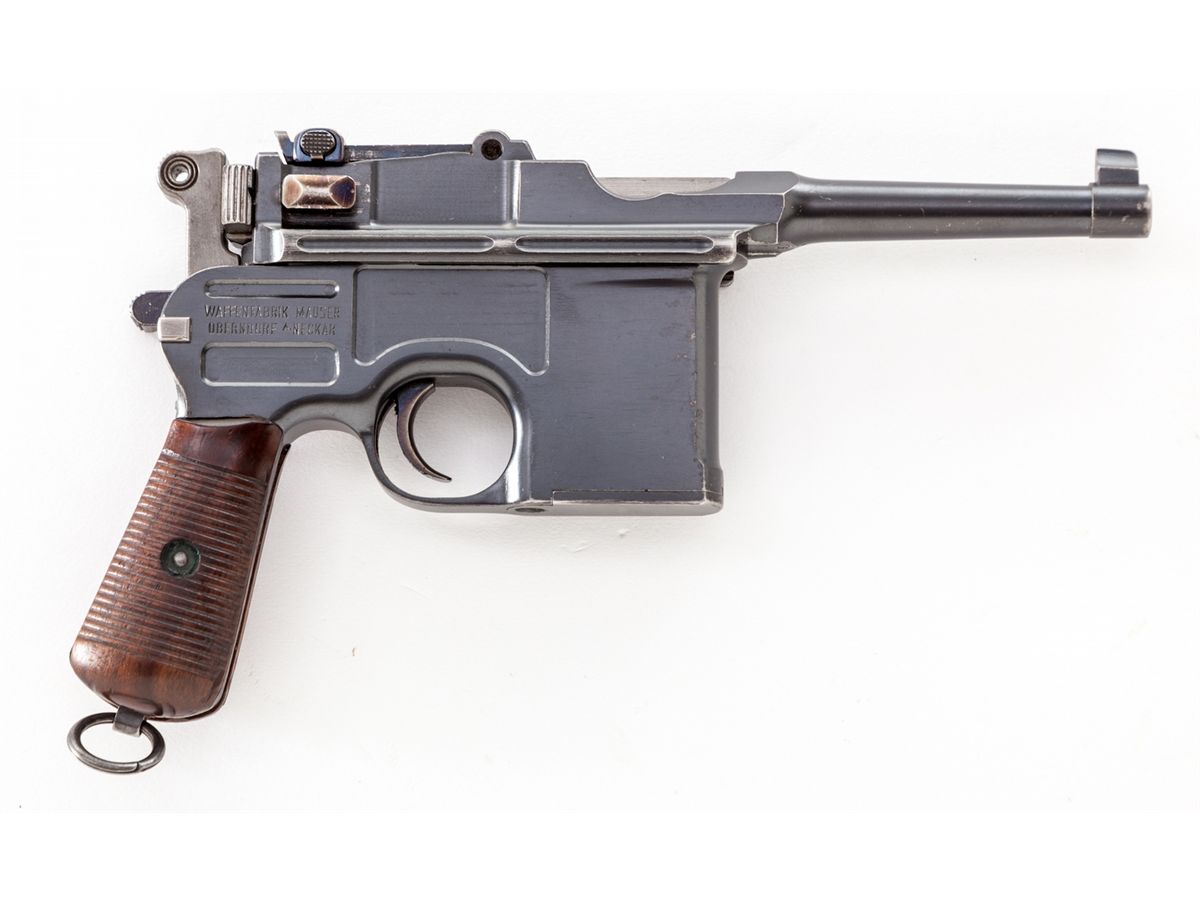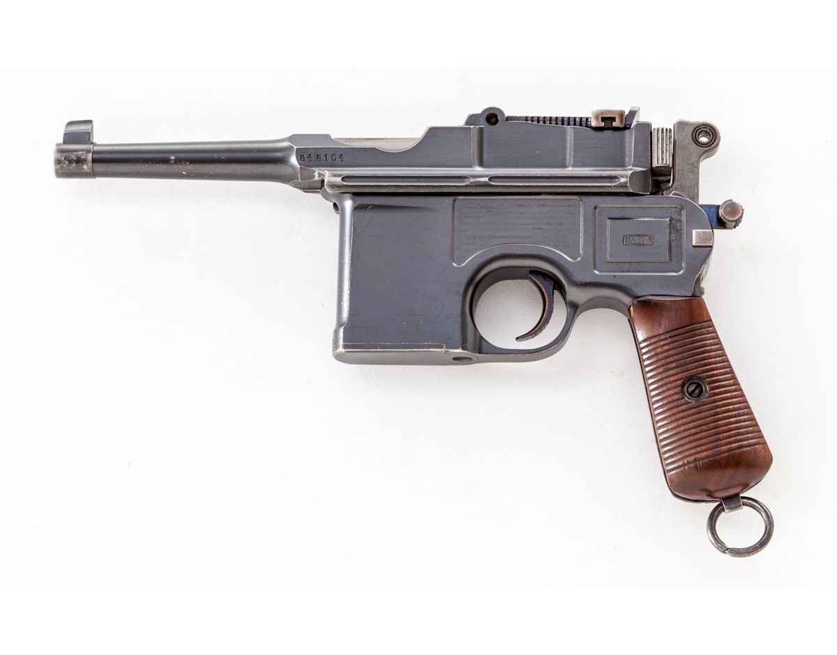 Late Post-War C-96 Bolo Semi-Automatic Pistol, #646104, 7.62mm (.30 Mauser) cal., 3.9'' barrel, blue finish, 22-groove walnut grips, with late adjustable rear sight marked ''50-1000'', late style safety, firing pin, trigger, and extractor. This particular variation is desirable in that it has a finish very similar to the Colt charcoal blue from the 1930s, and dating from that same period. Condition is excellent with very minor flaking to forward right edge of lower receiver. Thinning at muzzle and high edges, as well as minor thinning and toning to fire blued components. Grips with very small loss to top forward corner of left panel. Action is crisp, bore is bright. Est.: $1,800-$2,400. (C&R)