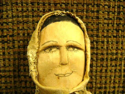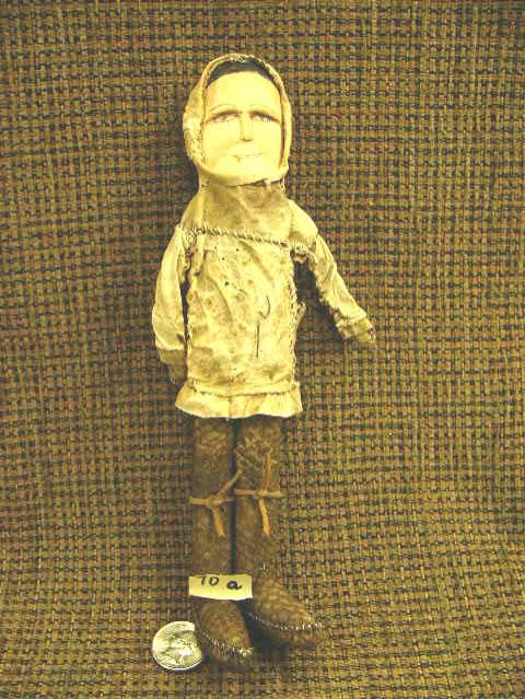 CHOICE on 2: Circa 1950 wood faced doll 9" tall salmon skin mukluk, seal skin parka with holes (2)