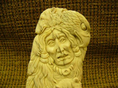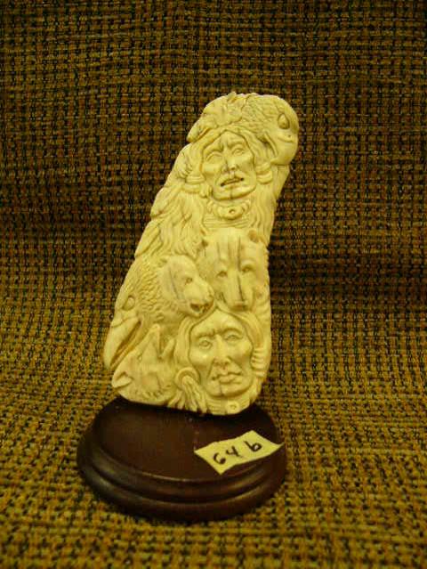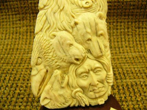 CHOICE on 2 bone relief carving of American Indian, wolves, eagles, bears on wood base 6" tall Imported (33)
