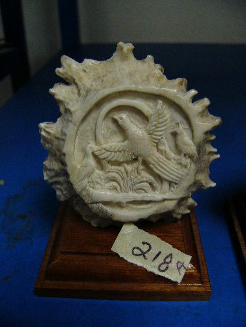CHOICE on 4 elk antler butt carvings: 3 birds and gun ()