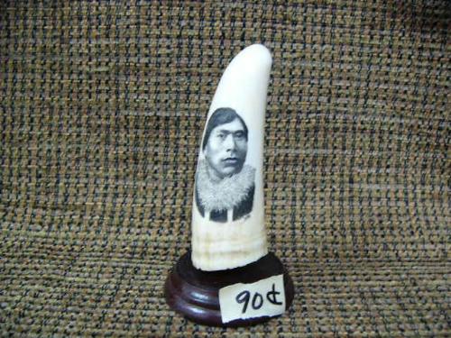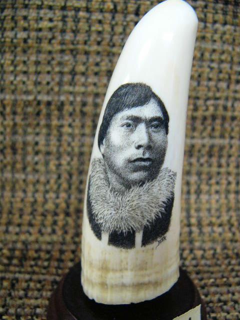 CHOICE on 4 ivory whales teeth from 3-3.5" tall scrimshawed on wood base: Alaska Native portrait (33)