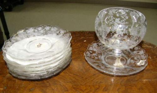 CHOICE on 8 sets of Cambridge Rosepoint Glass wear: 7 bread and butter plates 3900/20, mayonnaise cup with plate 3900/19 (189)