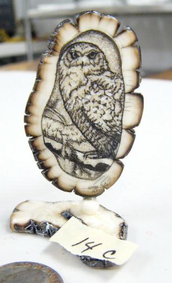 CHOICE on four 3" fossilized ivory platchet scrimshawed by Homer Cole: owl (114)