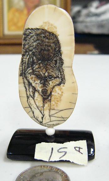 CHOICE on two 3" scrimshawed ivory mounted on baleen by Homer Cole: wolf (114)