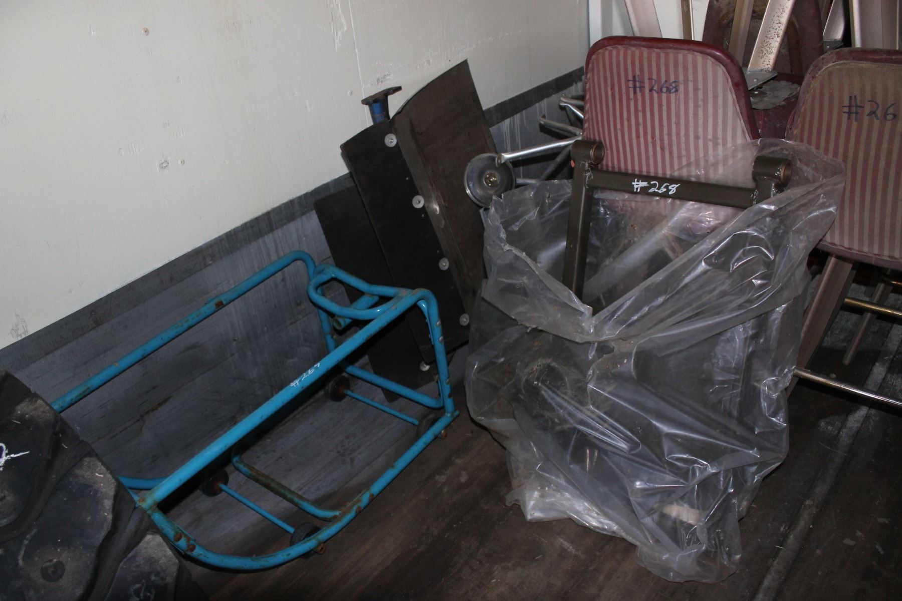 CHROME EXT ROLLER, 2 ORANGE BOLT BINS, 4 CHAIRS, 4 STOOLS, MUD FLAPS, MIRRORS & BLUE BARREL STAND