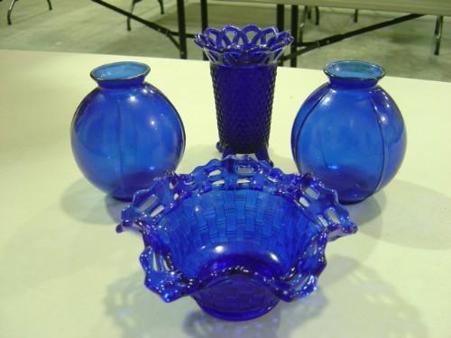 LOT OF 4 COBALT BLUE VASES AND BASKET
