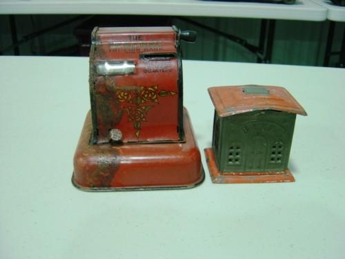 LOT OF TWO, TIN BANK COIN BANK, FEDERAL TRI-COIN BANK REGISTER (RUST ON LEFT SIDE)