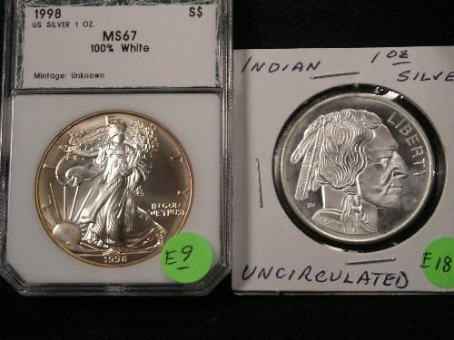 1998 U.S. SILVER EAGLE, GEM UNCIRCULATED MS-67, PROFESSIONALLY GRADED; INDIAN 1 OZ SILVER COIN, UNCIRCULATED
