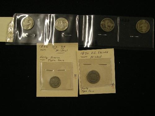 1870 U.S. SHIELD NICKEL,1866 U.S. 3 CENT COIN; SHEET OF 4 BUFFALO NICKELS 1929, '35, '36, '37