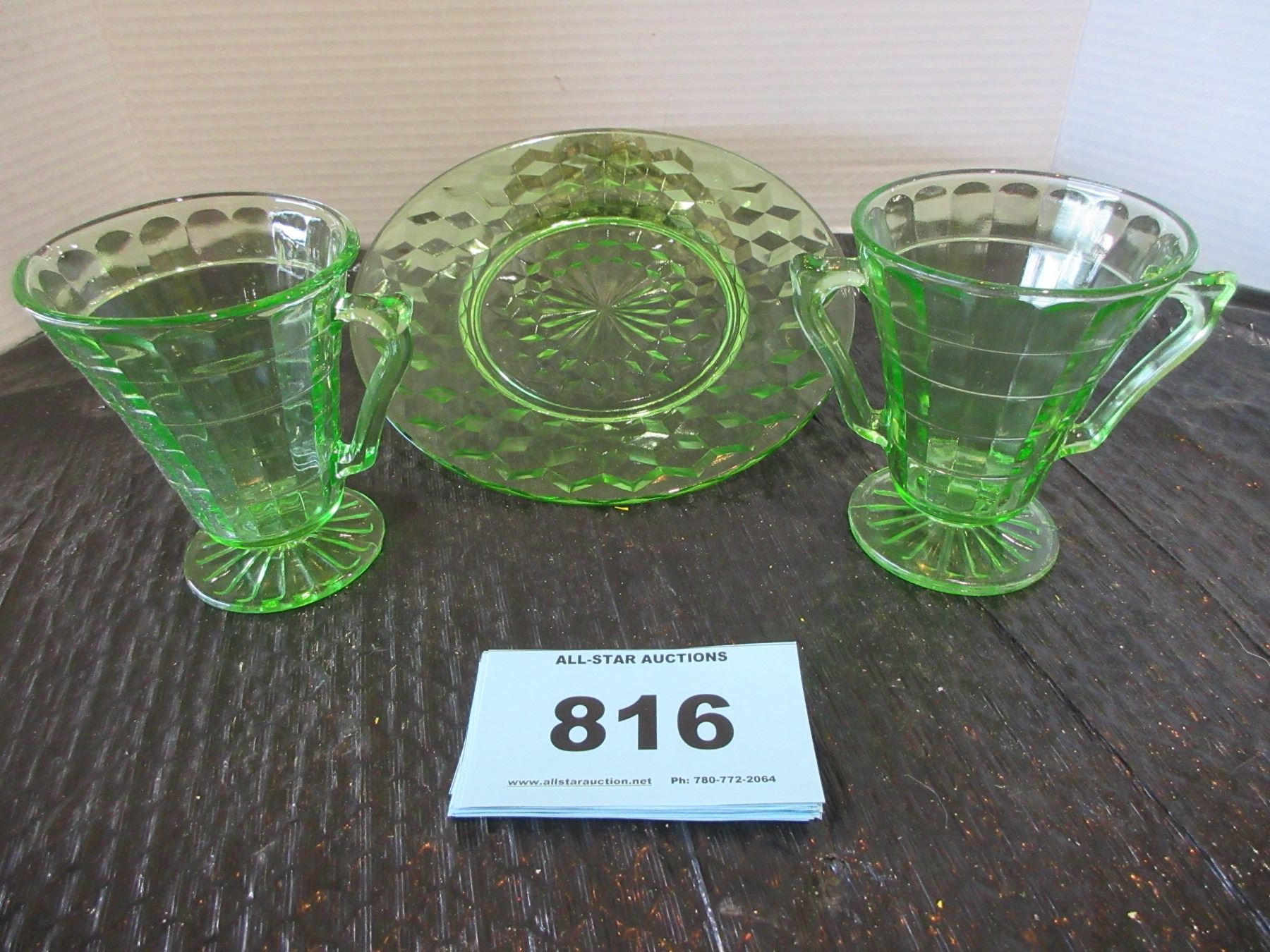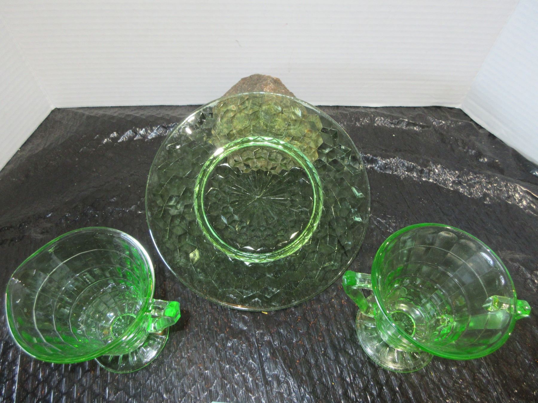 COLLECTABLE: DEPRESSION GLASS STYLE CREAM & SUGAR & PLATE SET