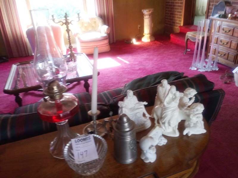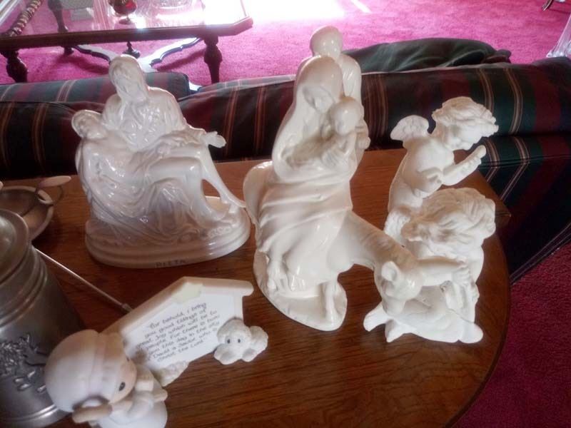 All items shown on table: Oil Lamp, Porcelain Figurines: Virgin Mary and Baby Jesus, The Pieta Madonna and Jesus, Cherubs, Precious Moments Shepard and Lamb,