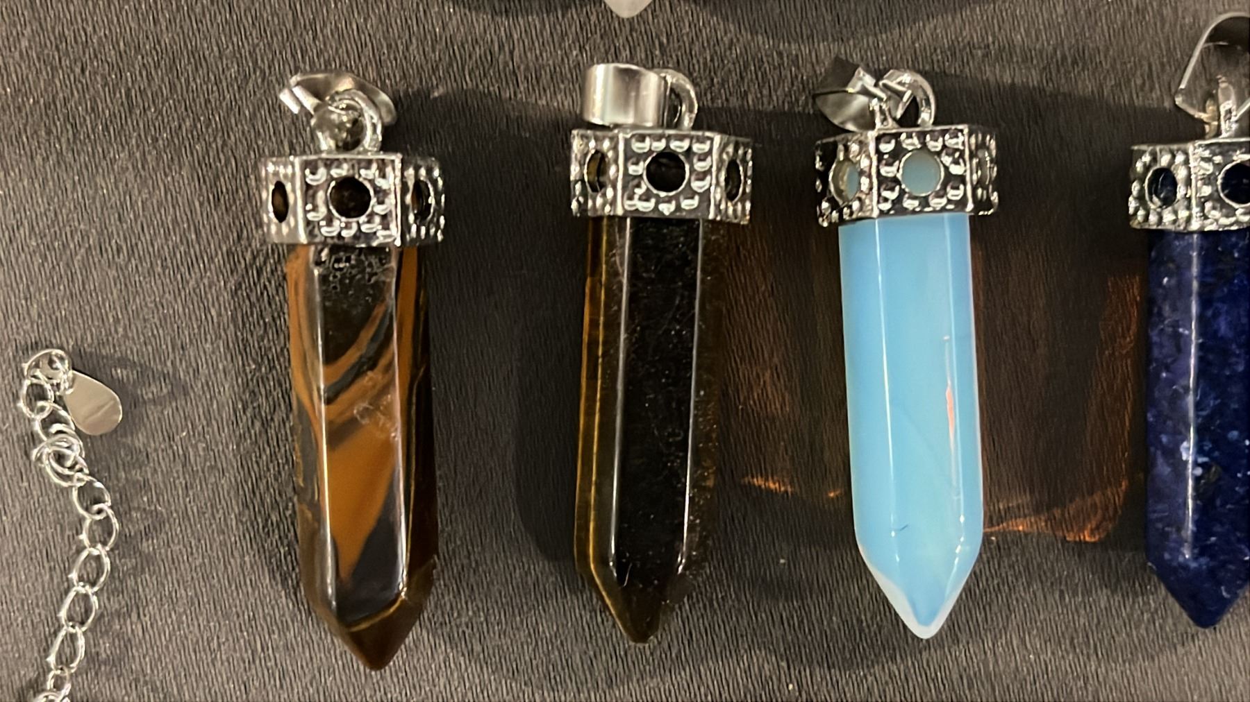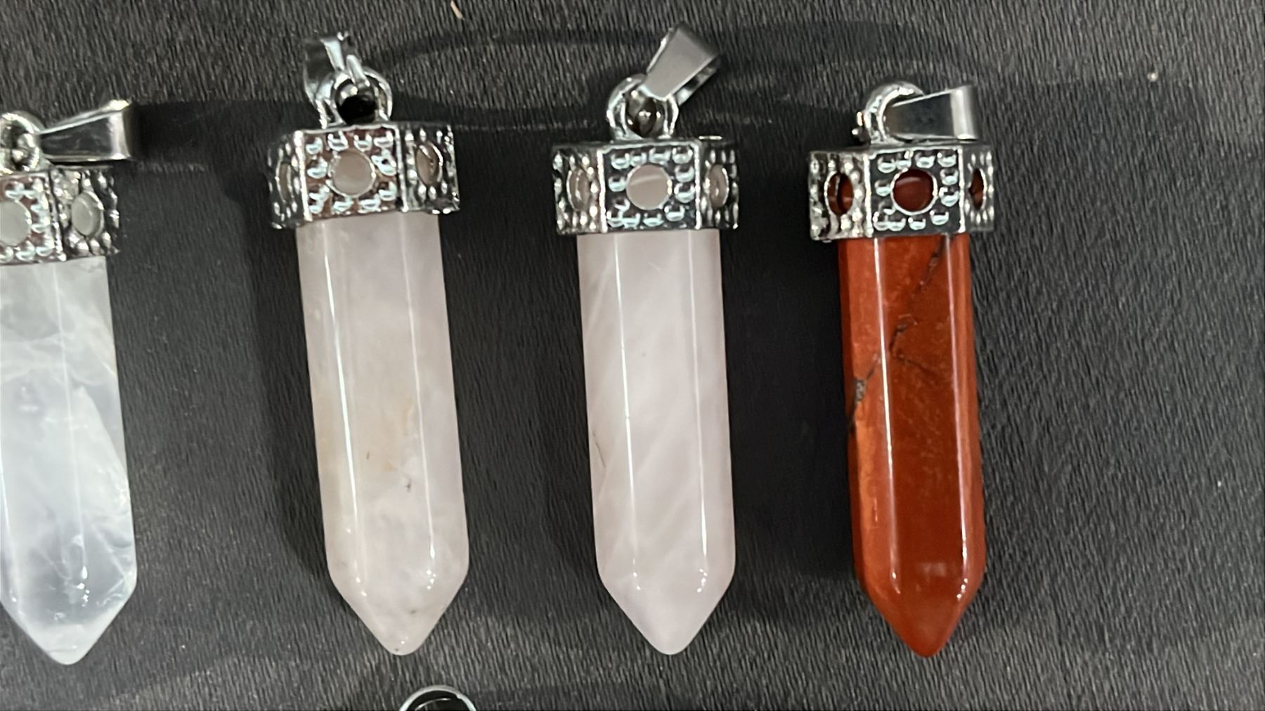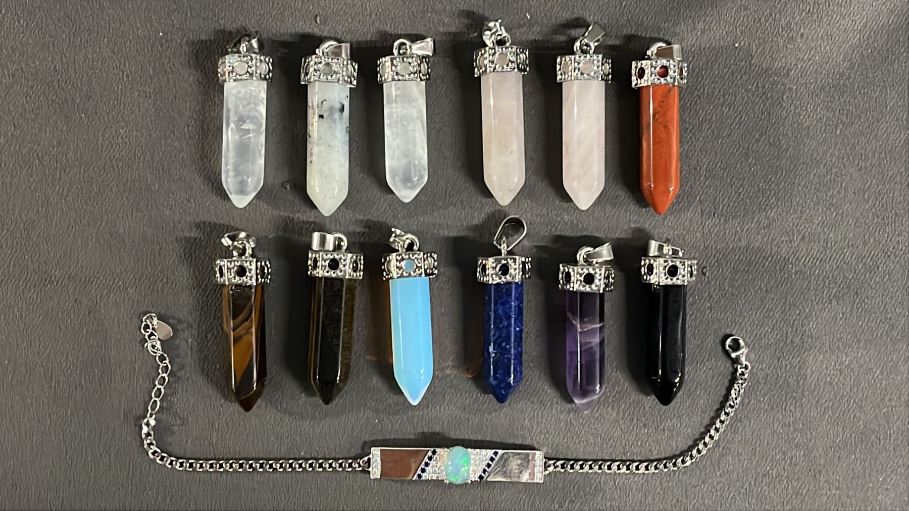 COLLECTION OF ASSORTED CRYSTAL POINT PENDANTS & A .925 SILVER BRACELET WITH A FIRE OPAL CABOCHON