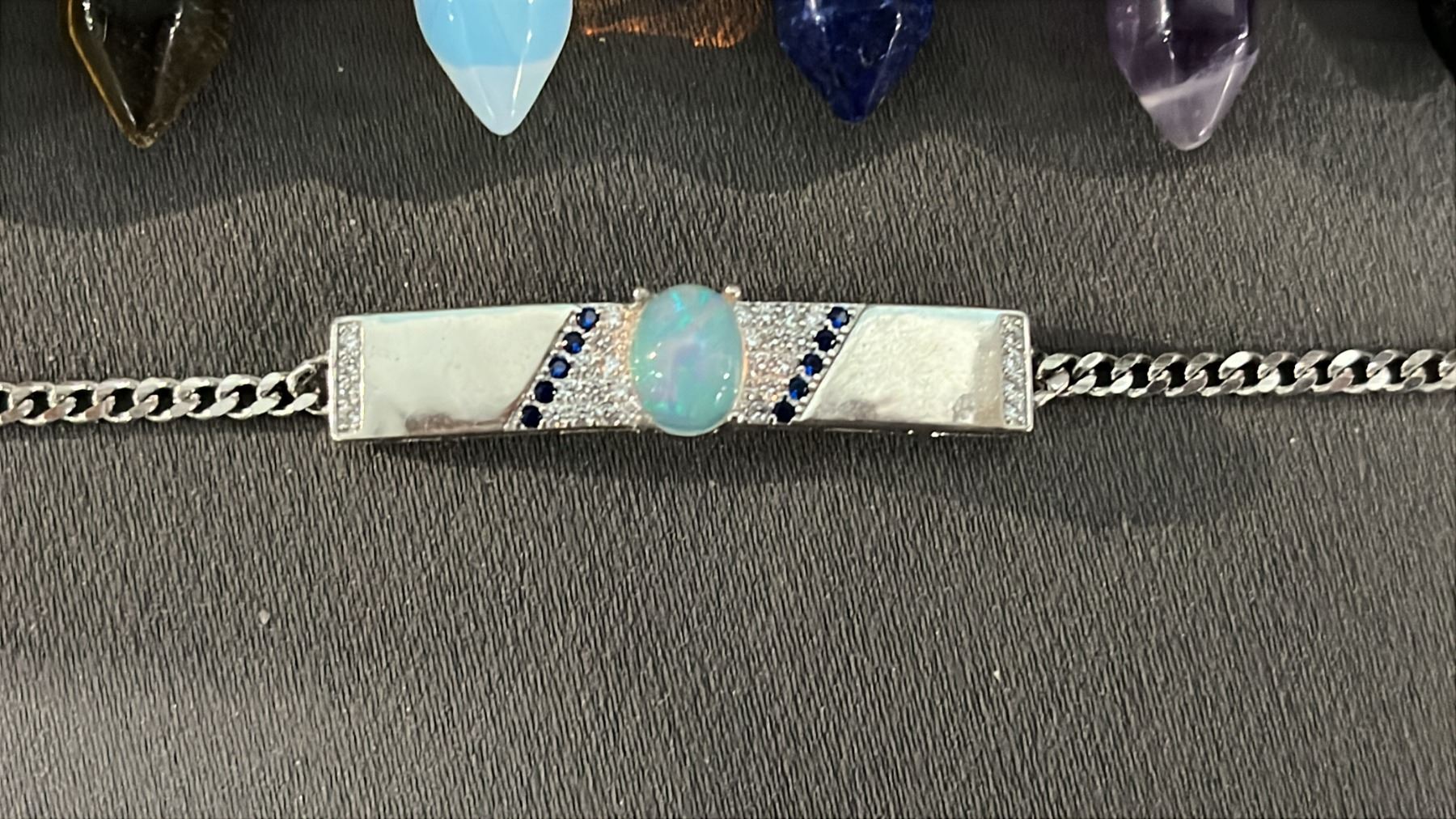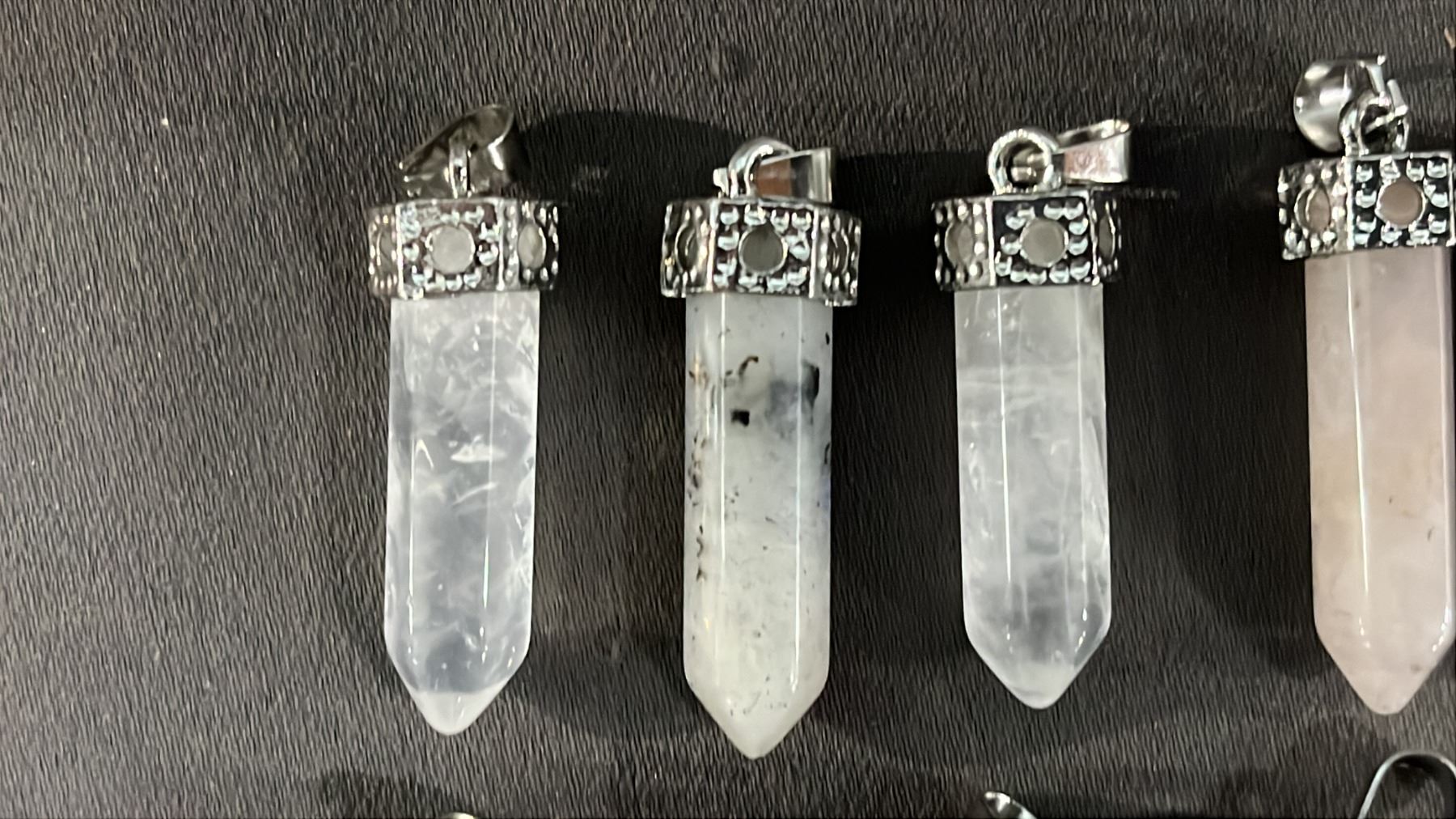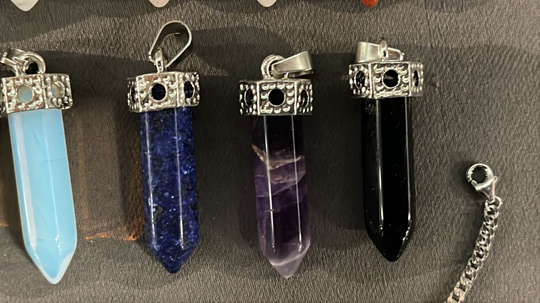 COLLECTION OF ASSORTED CRYSTAL POINT PENDANTS & A .925 SILVER BRACELET WITH A FIRE OPAL CABOCHON