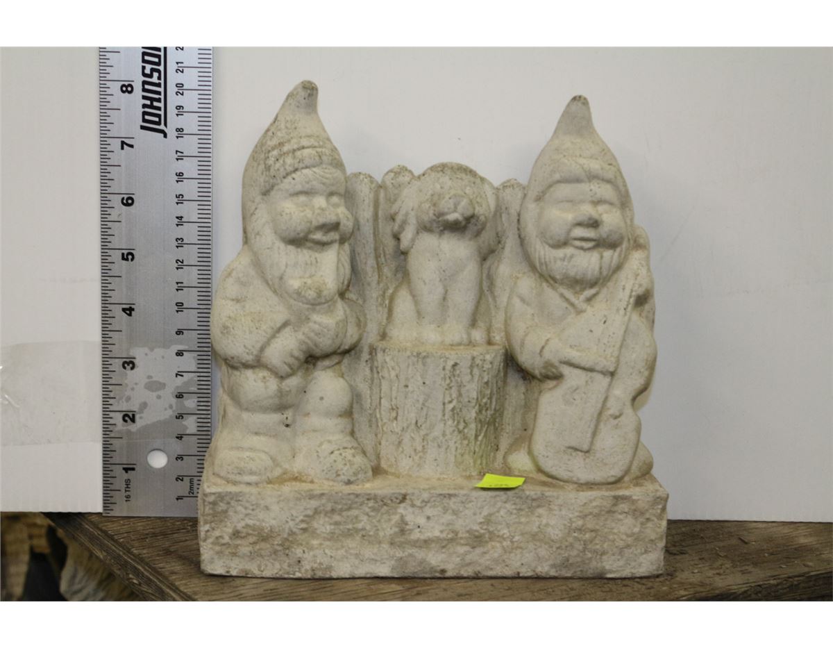CONCRETE GNOME AND DOG LAWN ORNAMENT