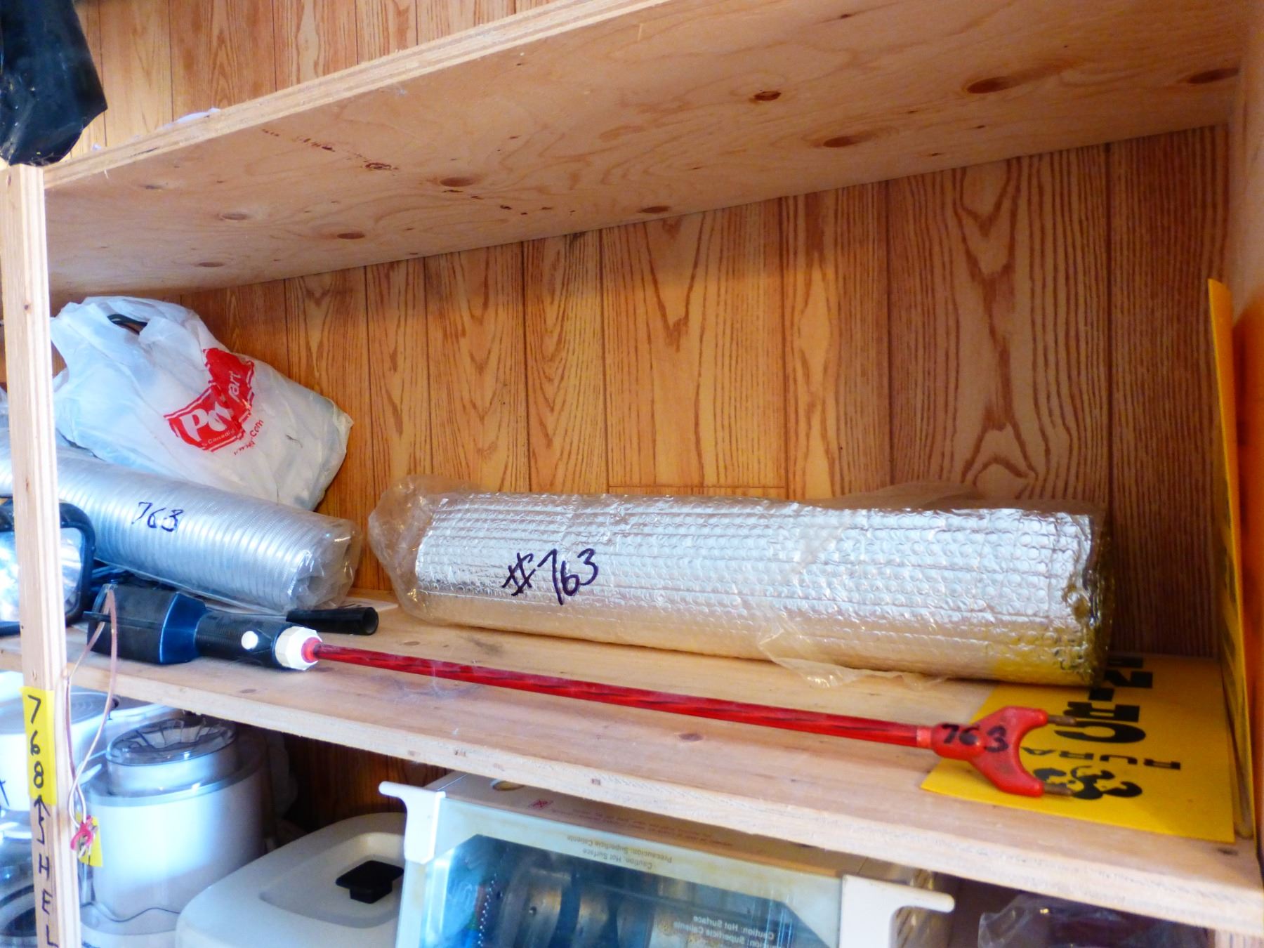 CONTENTS OF SHELF INCLUDING FLASH LIGHT, ZIPLOC BAGS, HARDWARE, ETC