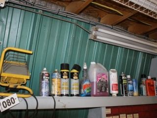 CONTENTS OF TOP SHELF, VARIOUS AEROSOL CANS, WORK LIGHT