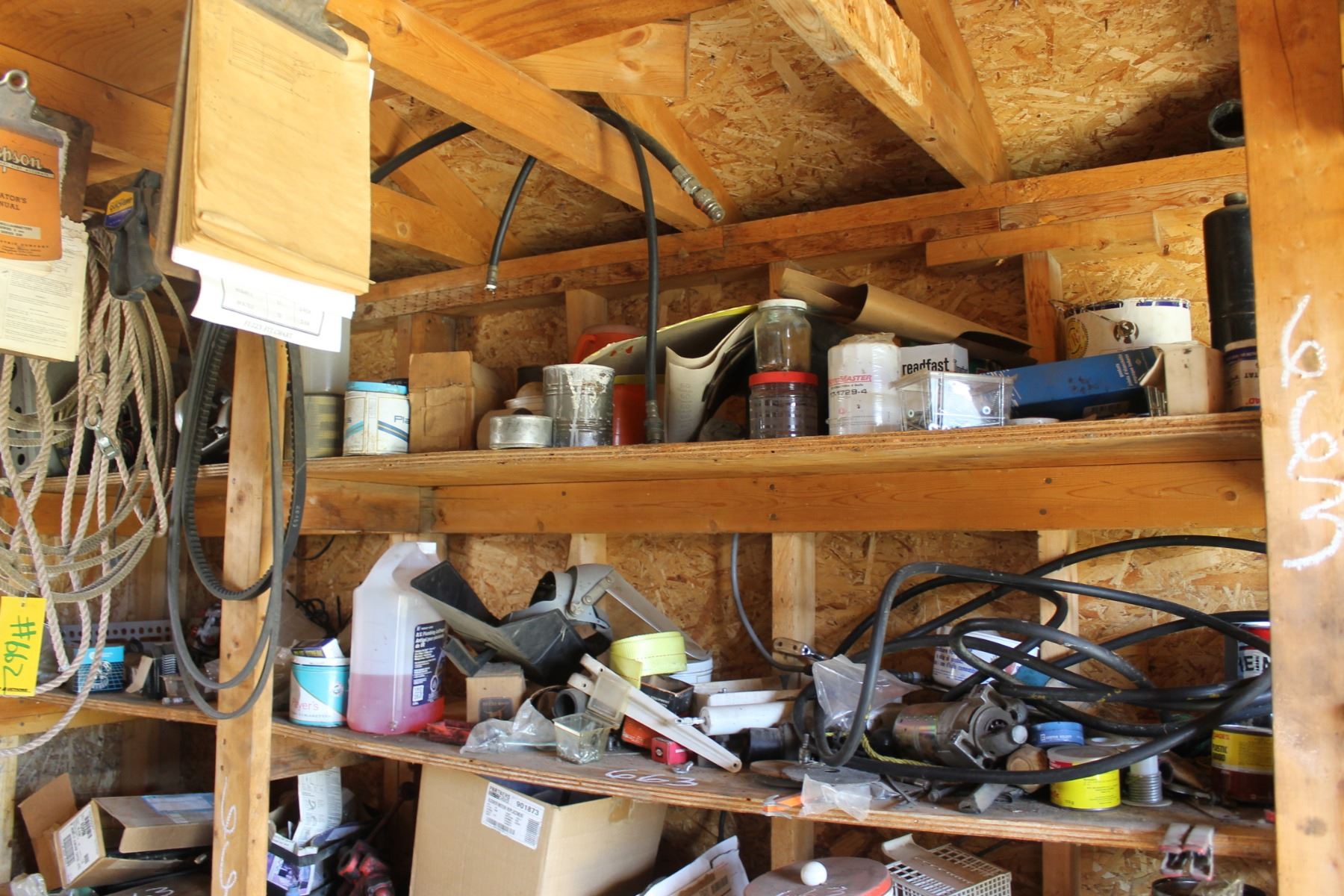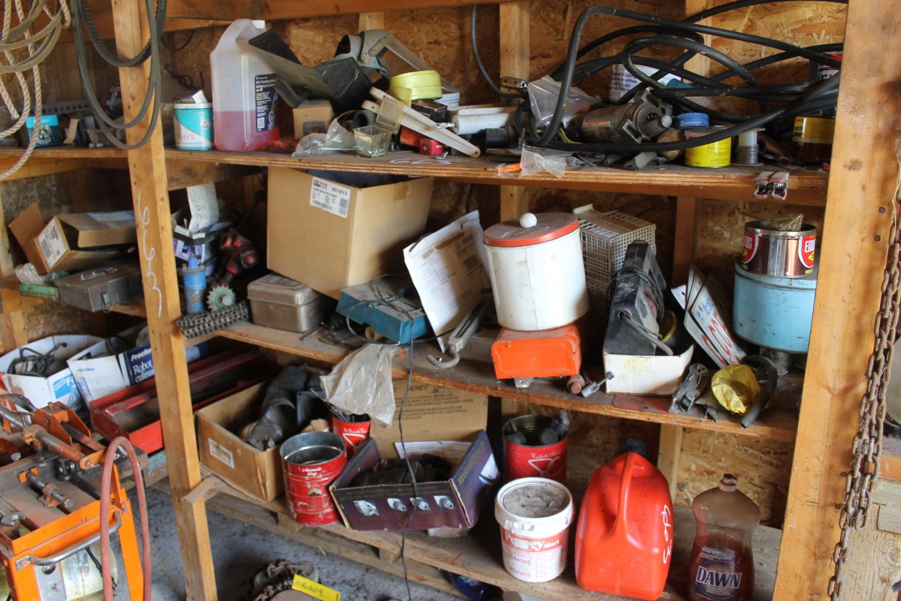 CONTENTS OF WOOD SHELF INCLUDING GERRY CANS, HOSE, HARDWARE, WINDSHIELD WASHER FLUID, ETC