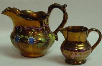 with floral decorations, height 4". Condition: 3 chips on rim / spout noted, hair line noted; together with a copper lustre individual creamer, height 2 ½", English, circa 1840.