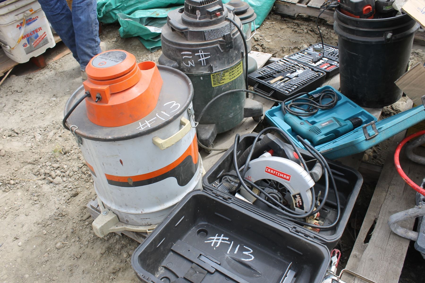 CRAFTSMAN CIRCULAR SAW, CRAFTSMAN DRILLS, MAKITA DRILL, DRILL BIT SET & 2 VACUUMS