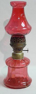 , kerosene burning with cranberry shade, 9 ¼" tall, circa late 19th ¢early 20th C. Condition: fount has been drilled for electrification.