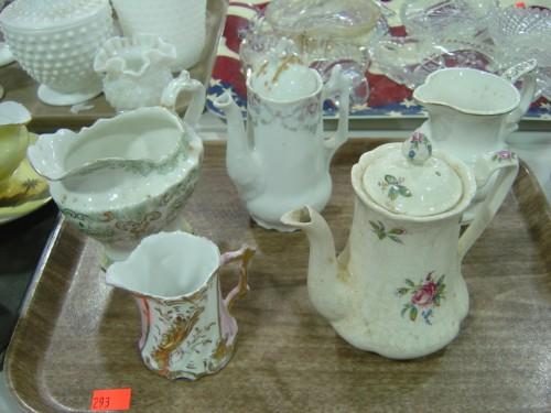 LOT OF 5 TEA POTS AND CREAMERS SHOWS AGE & SOME DAMAGE