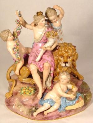 featuring a woman with with a cornucopia of flowers sitting atop a recumbent lion and surrounded by three figures of children, 10"x9"x7", Germany, circa 1865-1910. Condition: fingers and key held in woman's right hand are chipped.