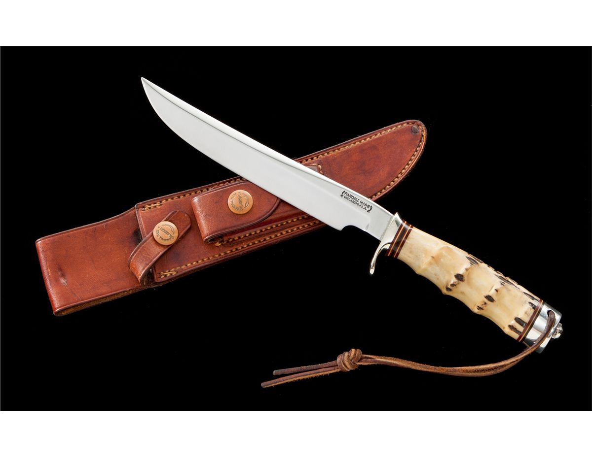 Circa 1960s Randall Model 3 ''Hunter'' Knife, 7-1/4'' blade is marked ''RANDALL MADE/ORLANDO, FLA.'' The overall length is 12''. Deep choil, stag handle with inlaid nickel silver blank name plate, seven spacers, nickel silver half guard, aluminum pommel, and leather boot lace style wrist thong. Early Johnson rough back sheath stamped with the ''Randall'' football-shaped logo and ''3-7'' on the back side of the belt loop. Brown plastic ''Randall'' marked snaps, and a unmarked two part combination Crystolon sharpening stone. Condition is excellent, showing very light use. Sheath with crisp snaps, tight stitching and seams. Sharpening stone is also used. A very nice example of a 60's Randall knife. Est.: $750-$1,000.