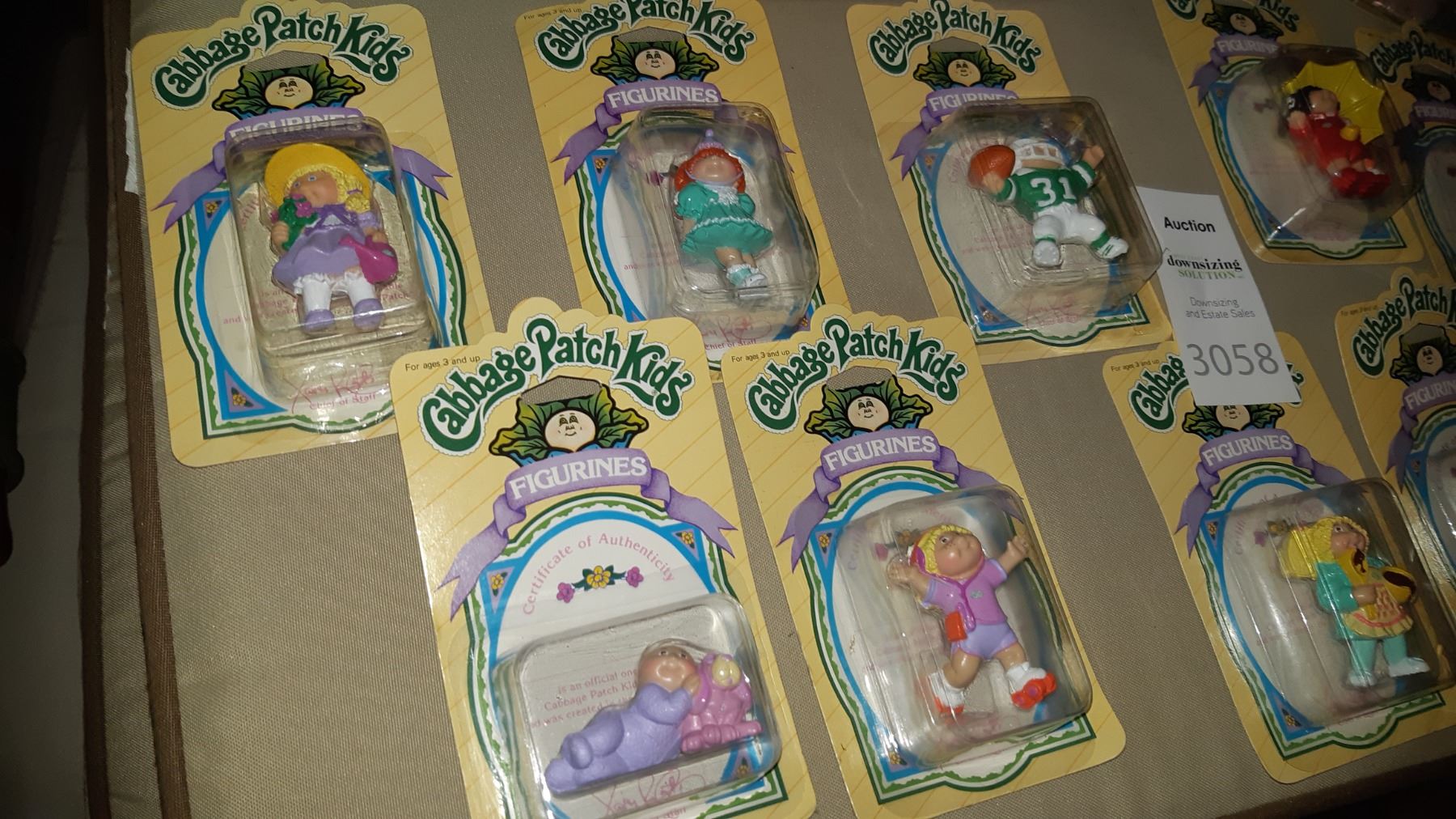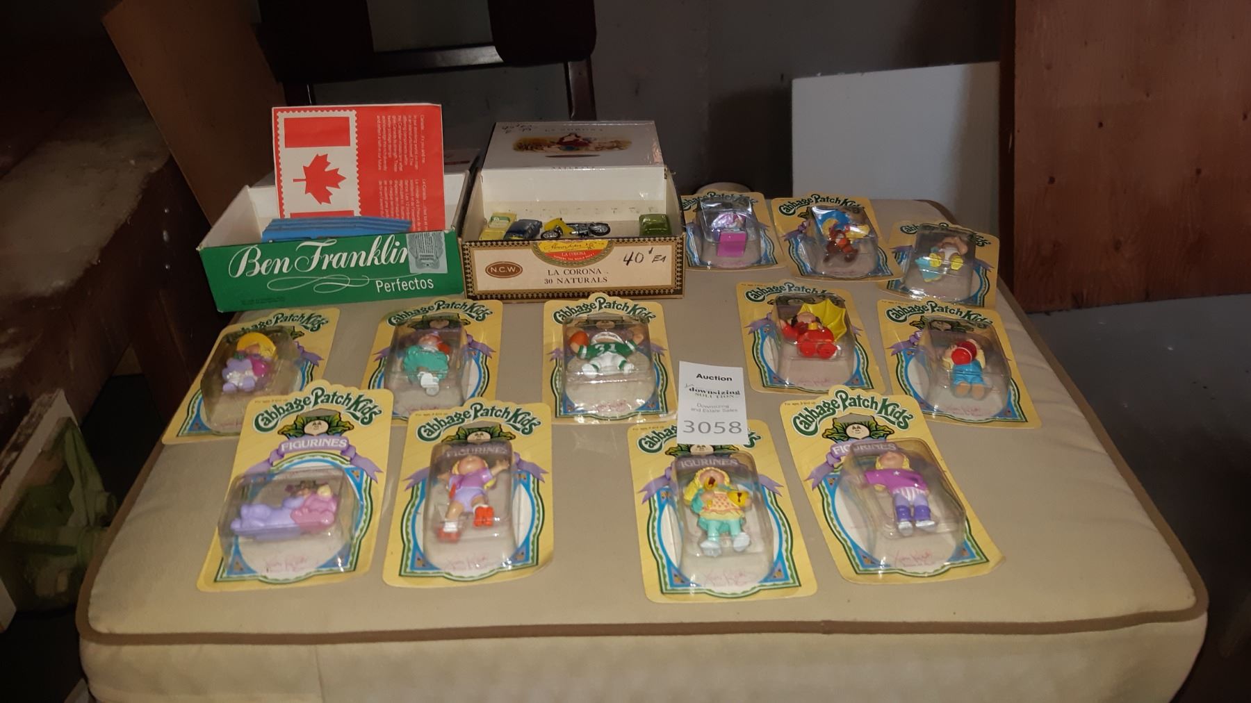Including unopened Cabbage Patch figurines, metal cars and cigar boxes.