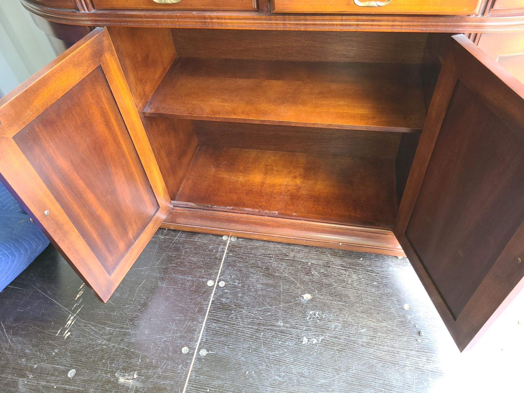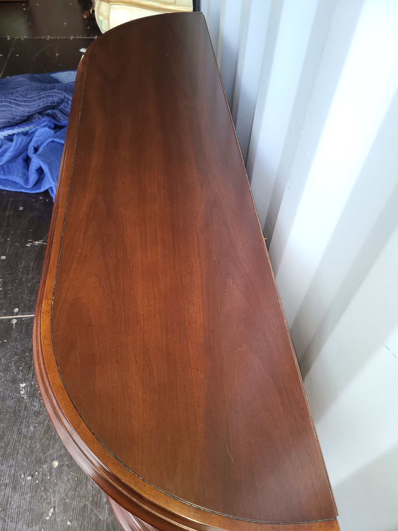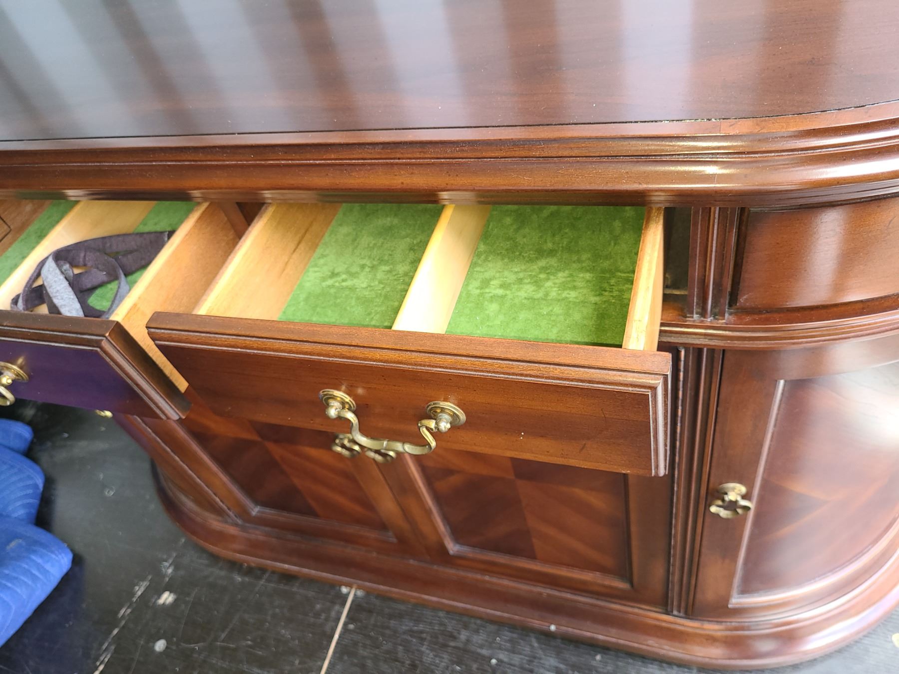 Nice condition sideboard with rounded ends and hidden compartments to the side of each upper curved drawer. 53x14x33 Pickup at 11 am