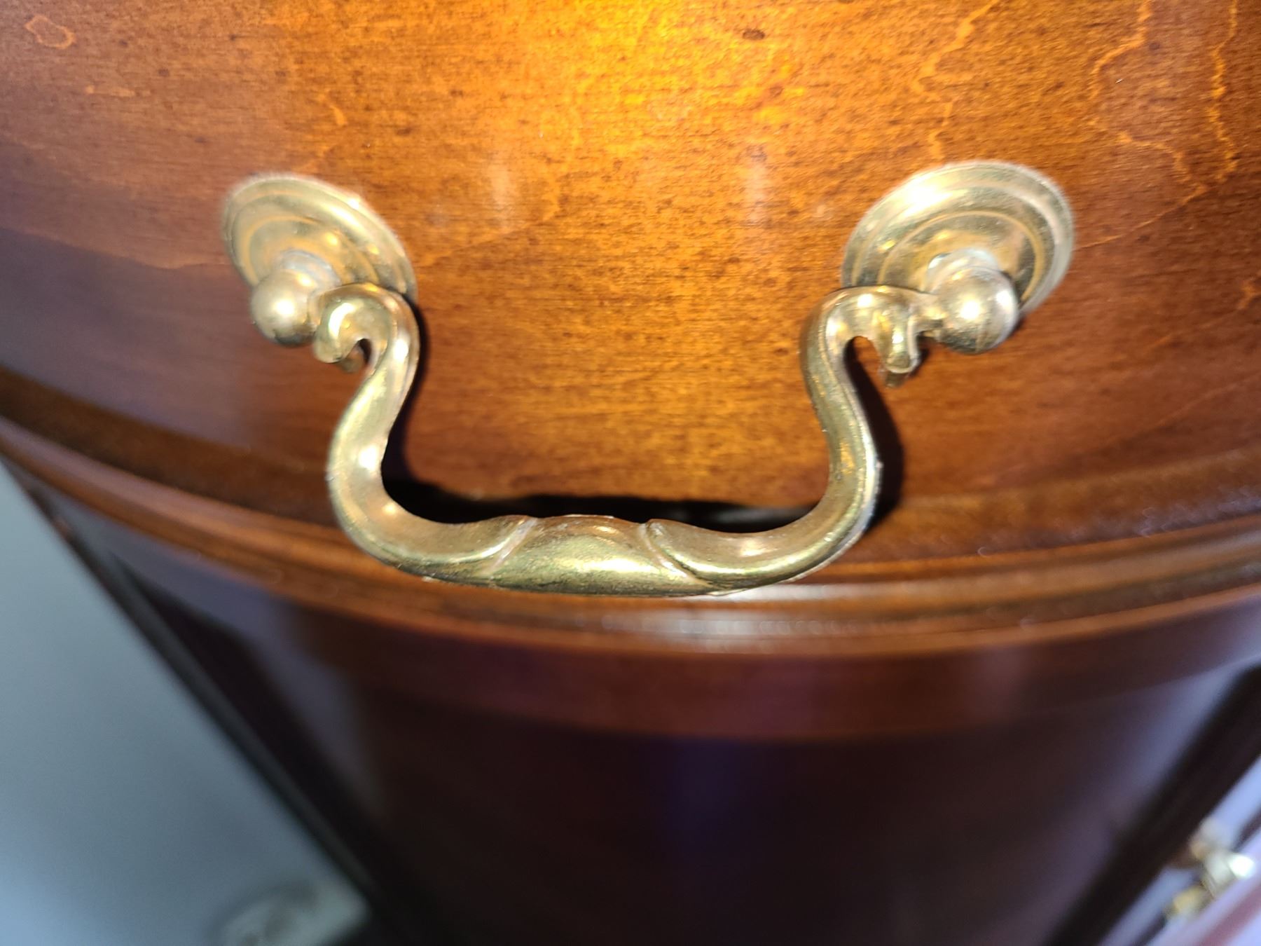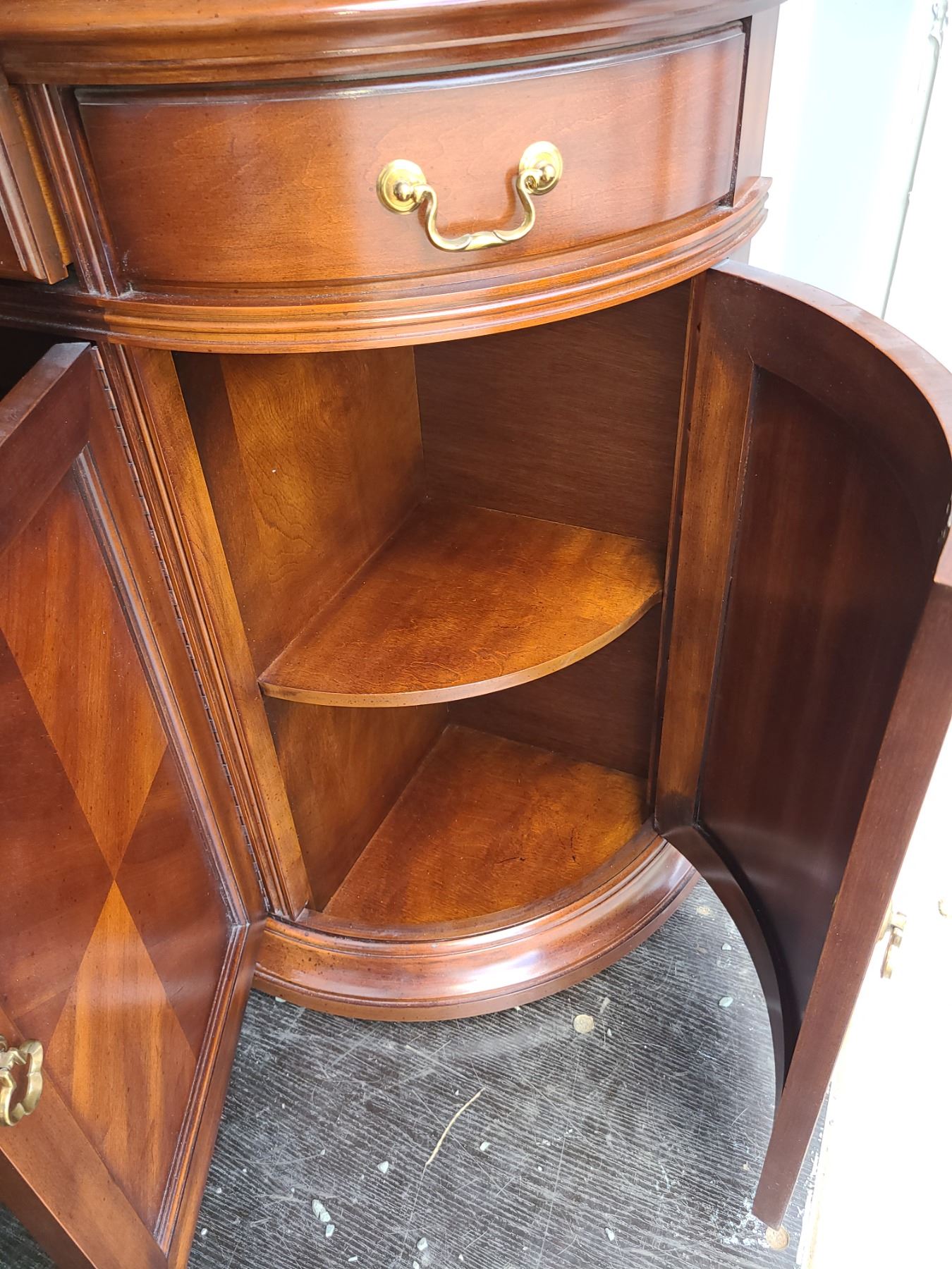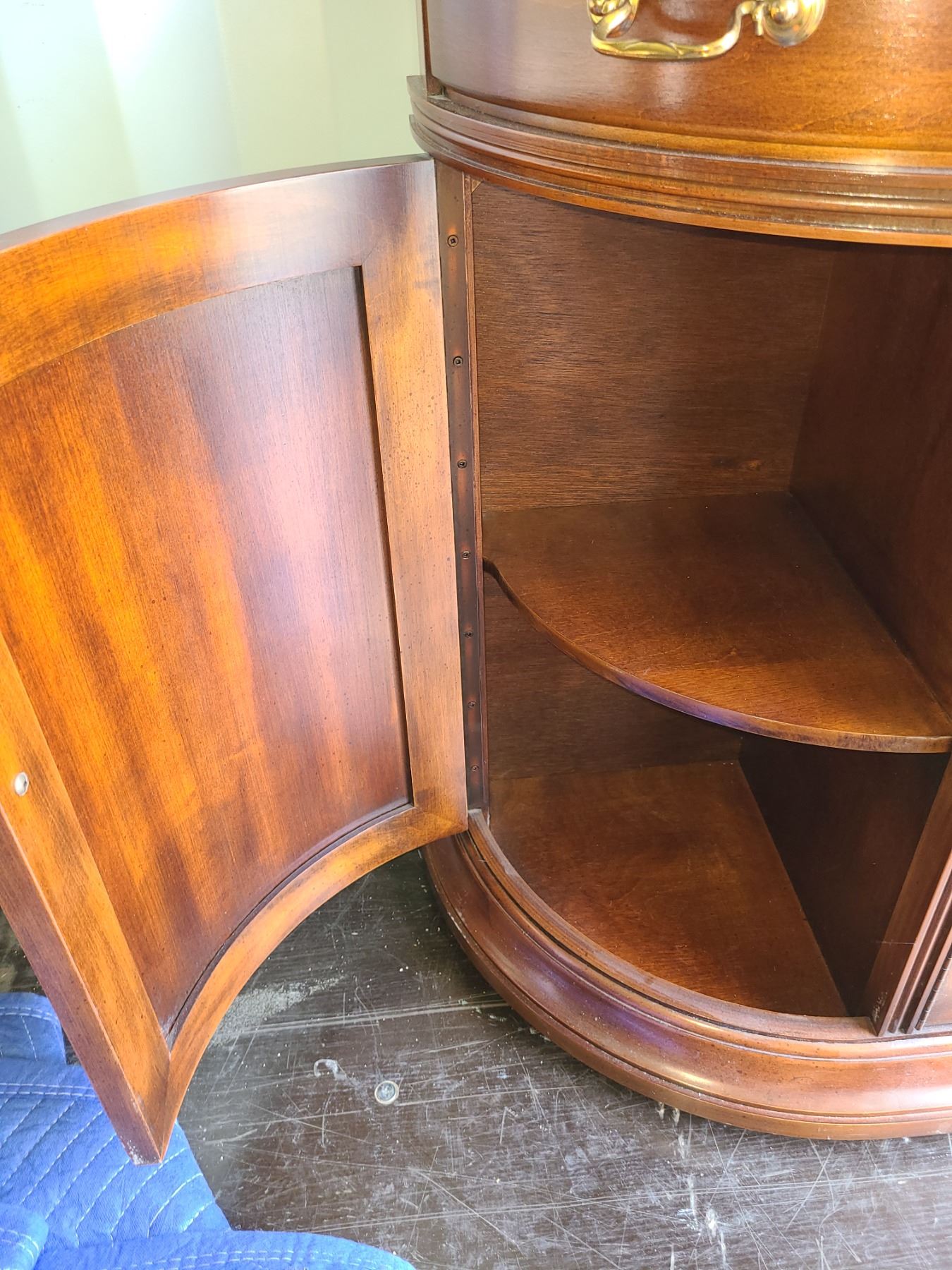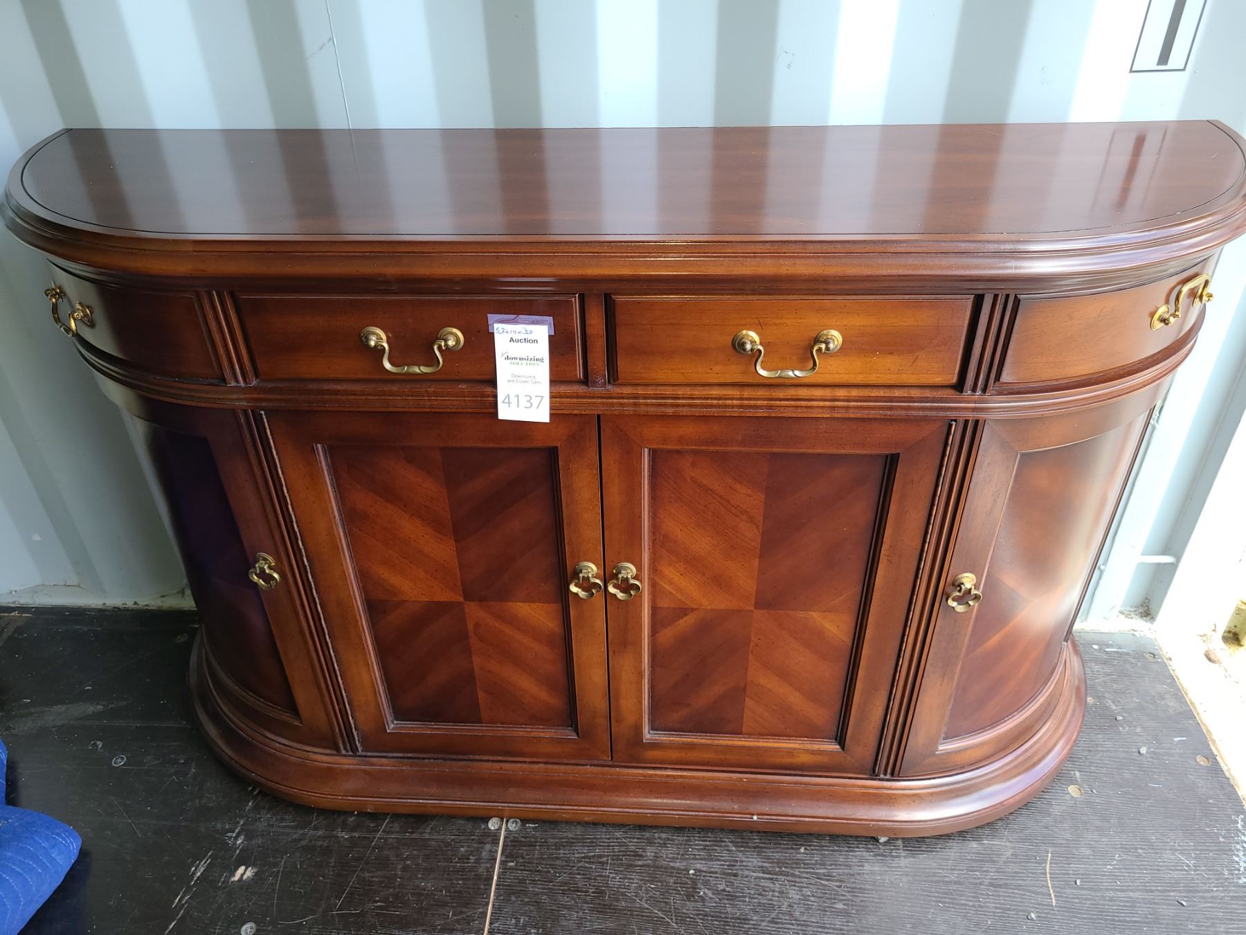 Nice condition sideboard with rounded ends and hidden compartments to the side of each upper curved drawer. 53x14x33 Pickup at 11 am