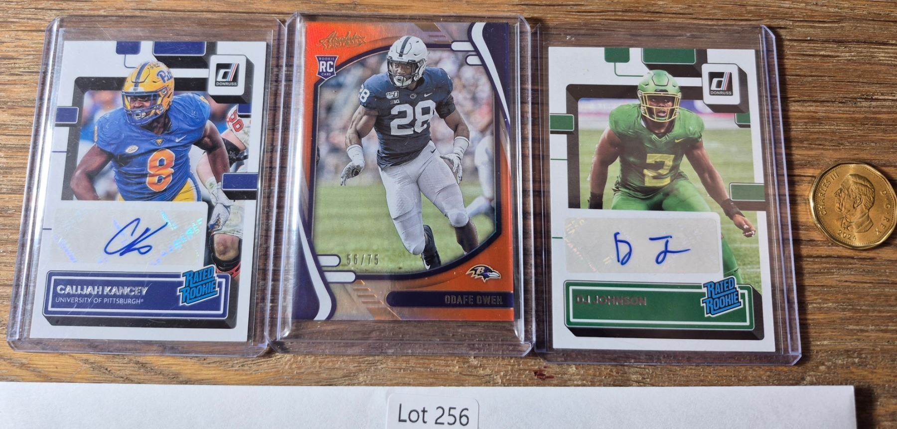 Three-card defensive stars lot featuring two Donruss Rated Rookie autographs and a numbered Absolute rookie.