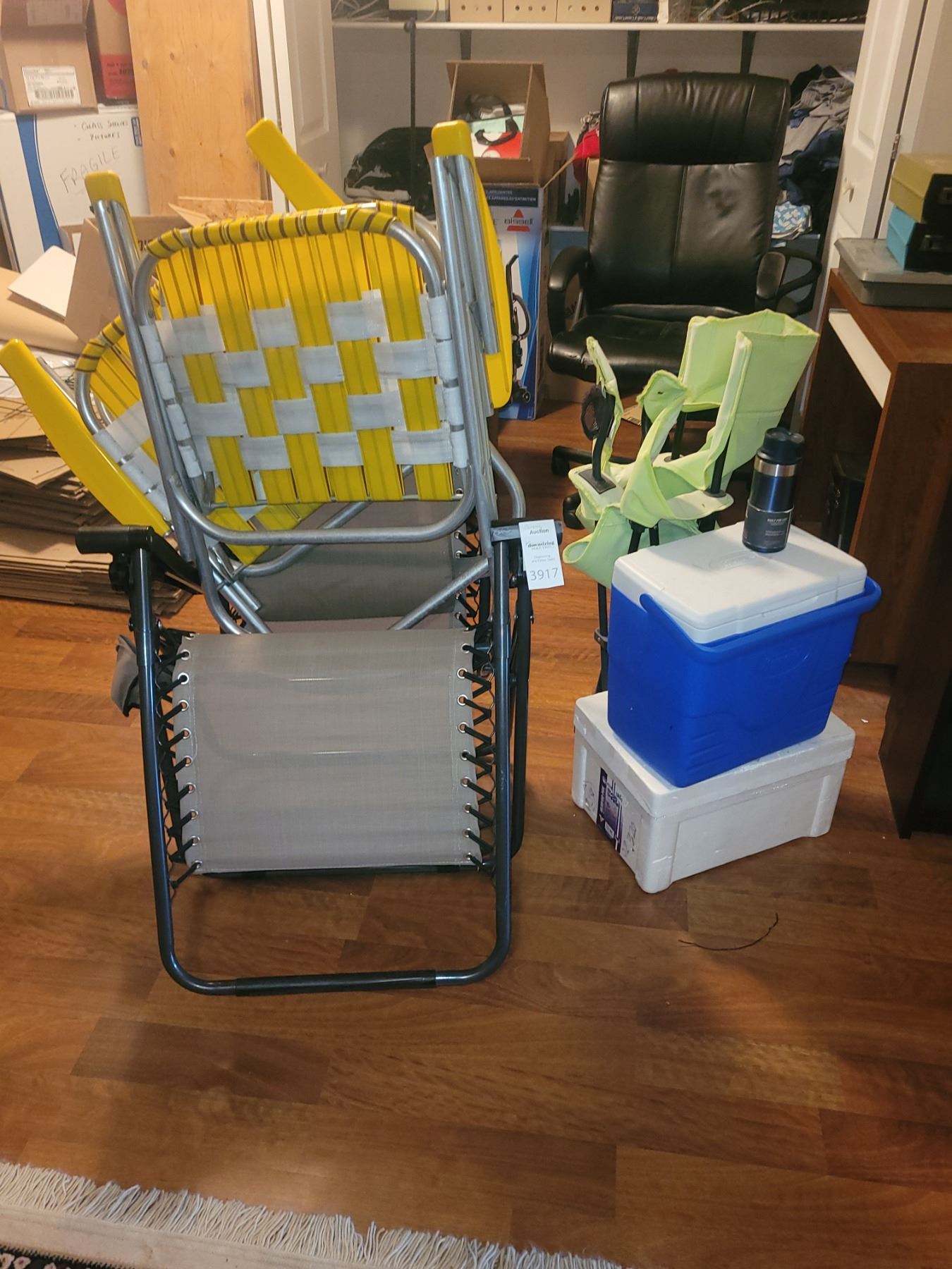 Coleman cooler, styrofoam cooler, 2 vintage fold out chairs and a lounger. Pickup at 10 am