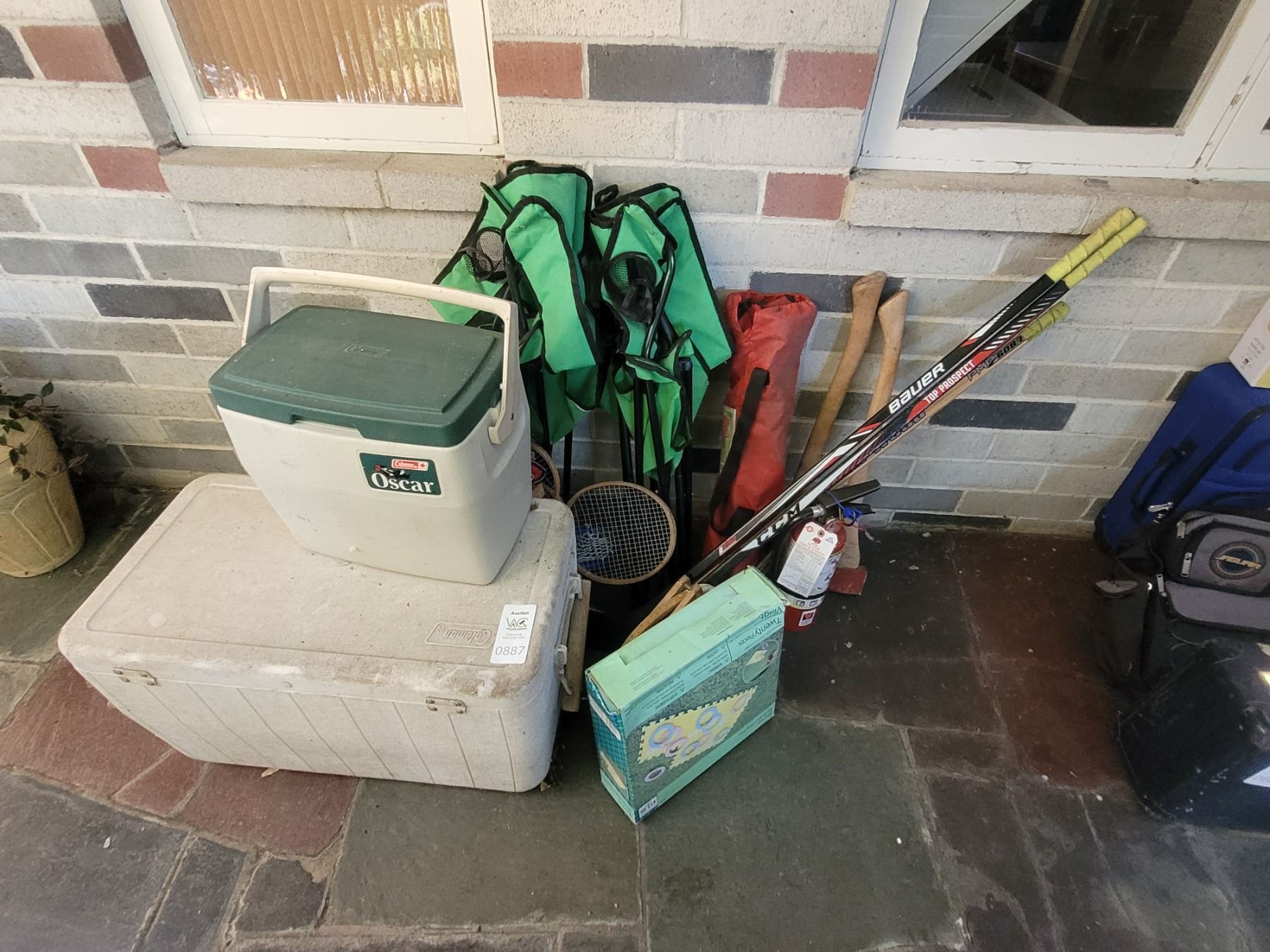 Camping chairs, stool, Norma 2 man tent. Axes, fire extinguisher, Coleman Coolers and more. Pickup at 10 am