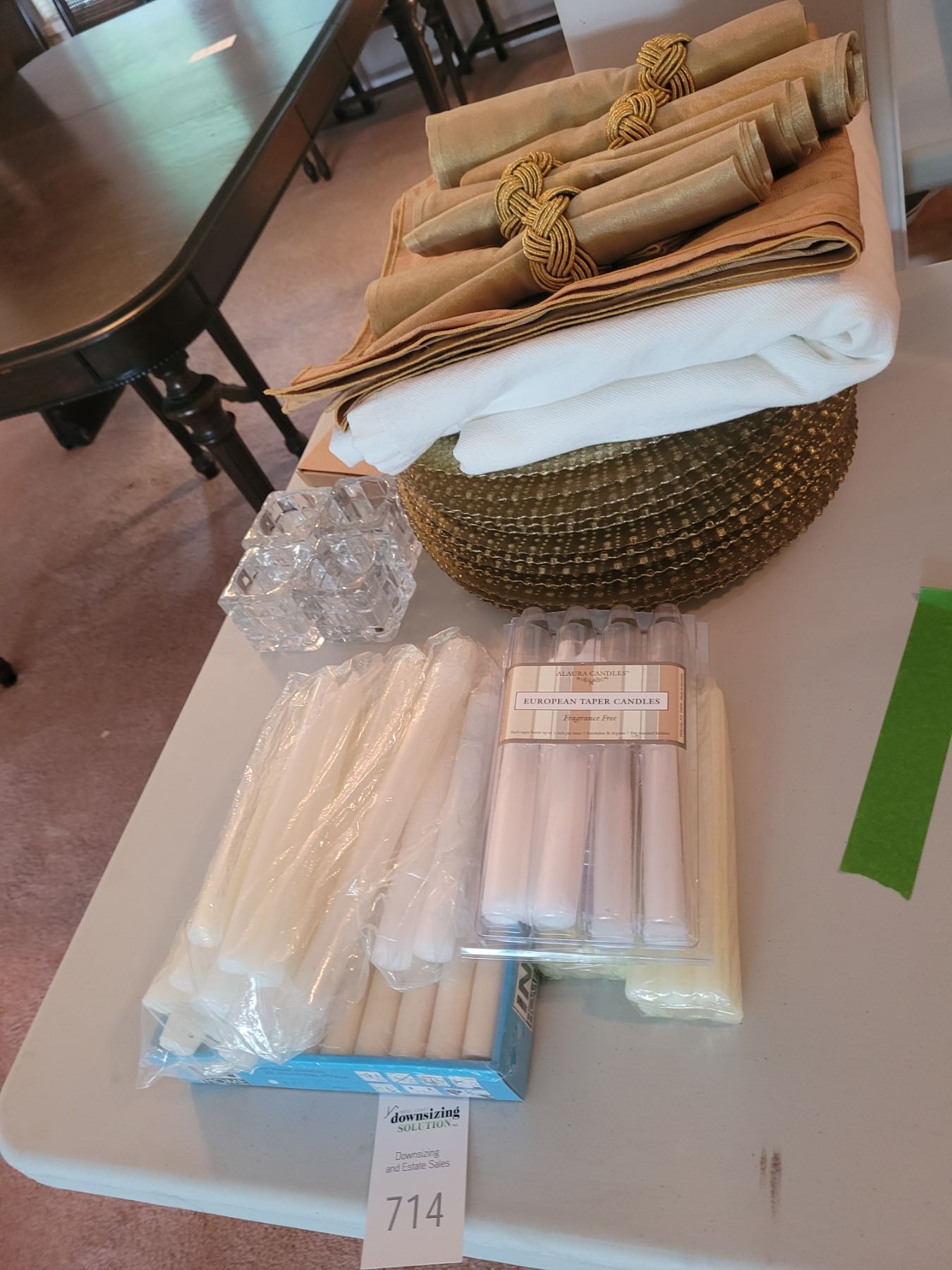 Wax candles, 12 gold coloured glass chargers, tablecloth, napkins, holders. Pick up 9-11