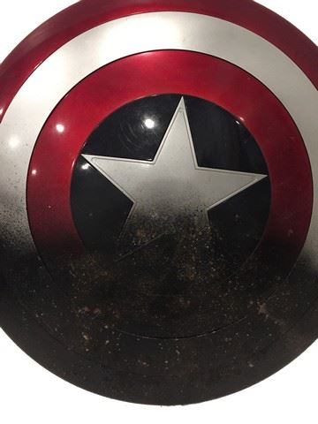 Captain America: The Winter Soldier (2014) – Captain America’s (Chris Evans) burnt shield production study, with brown leather straps on the back. This prop played a crucial role in the design process for the final screen-used shield. (approx.27")