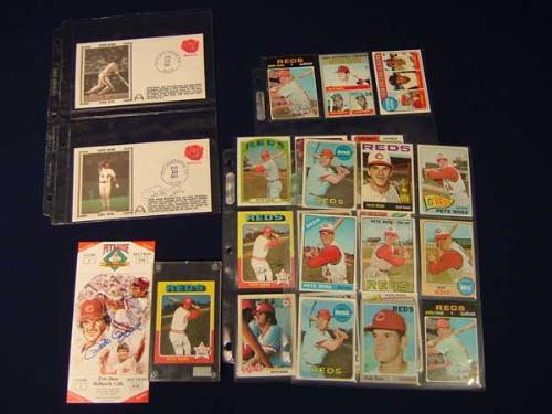 Grouping of Pete Rose cards including: 1975 Canadian Topps Pete Rose card; 21 Topps cards including 1968 & 1969 National League Batting Leaders . Together with autographed "Pete Rose Ballpark Café" card. And 2 Commemorative Envelopes (postmarked), 3,630 hits and 3,631 hits (autographed).