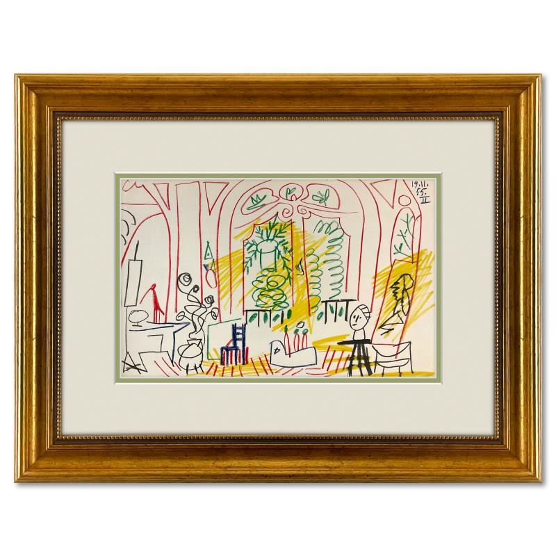 "Carnet de Californie 19.11.55-II" is a vintage lithograph on paper by Pablo Picasso (1881-1973). This piece is from Picasso's Carnet de Californie Series and was printed in Paris, France by Mourlot Studios in 1959. This piece comes framed. Includes Letter of Authenticity. Measures approx. 18.5" x 24.5" (frame), 10.5" x 16.5" (image). This item requires special handling and may have a longer than usual turnaround.