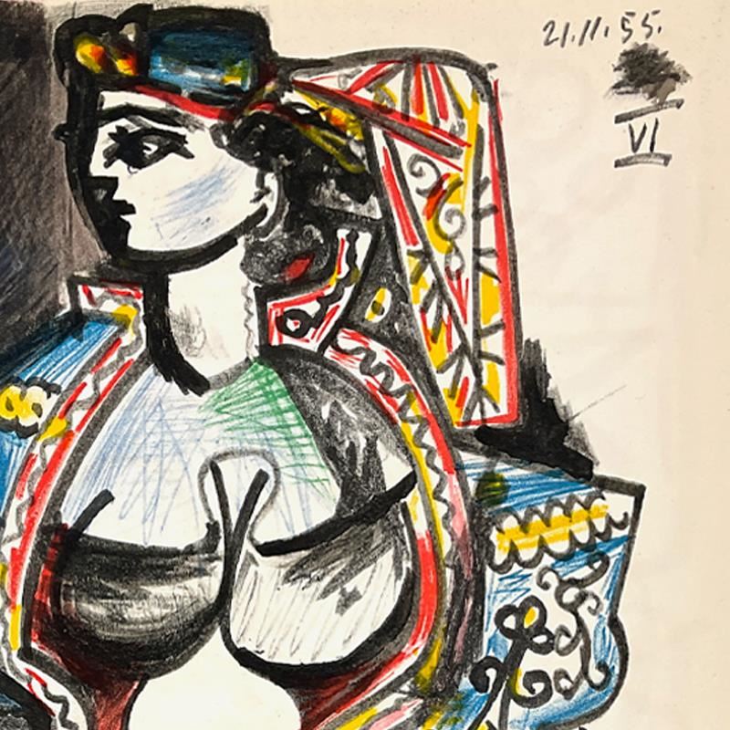 "Carnet de Californie 21.11.55-VI" is a lithograph on paper by Pablo Picasso (1881-1973). This piece is from Picasso's Carnet de Californie Series and was printed in Paris, France by Mourlot Studios in 1959. This piece comes framed. Includes Letter of Authenticity. Measures approx. 24.5" x 18.5" (frame), 16.5" x 10.5" (image). This item requires special handling and may have a longer than usual turnaround.