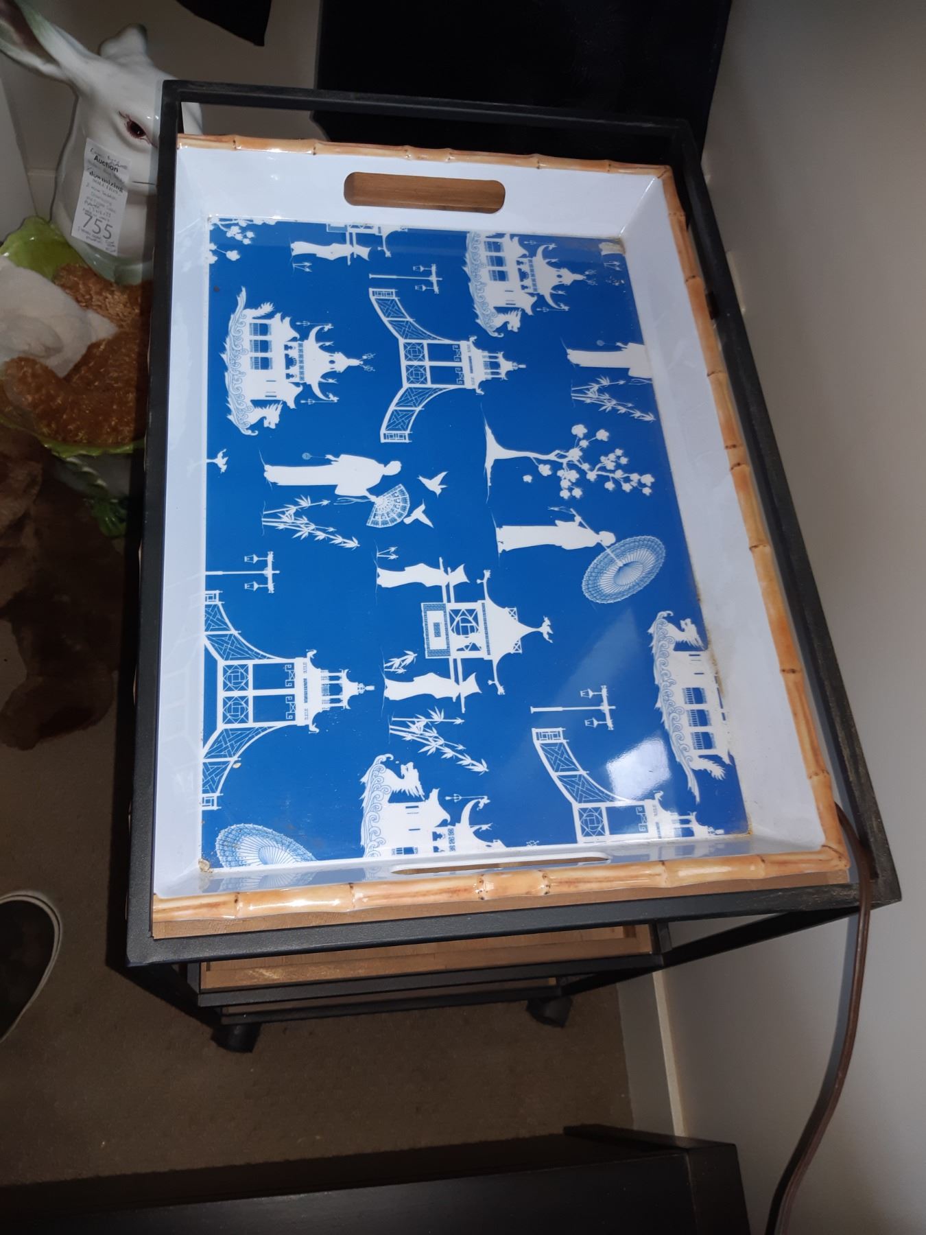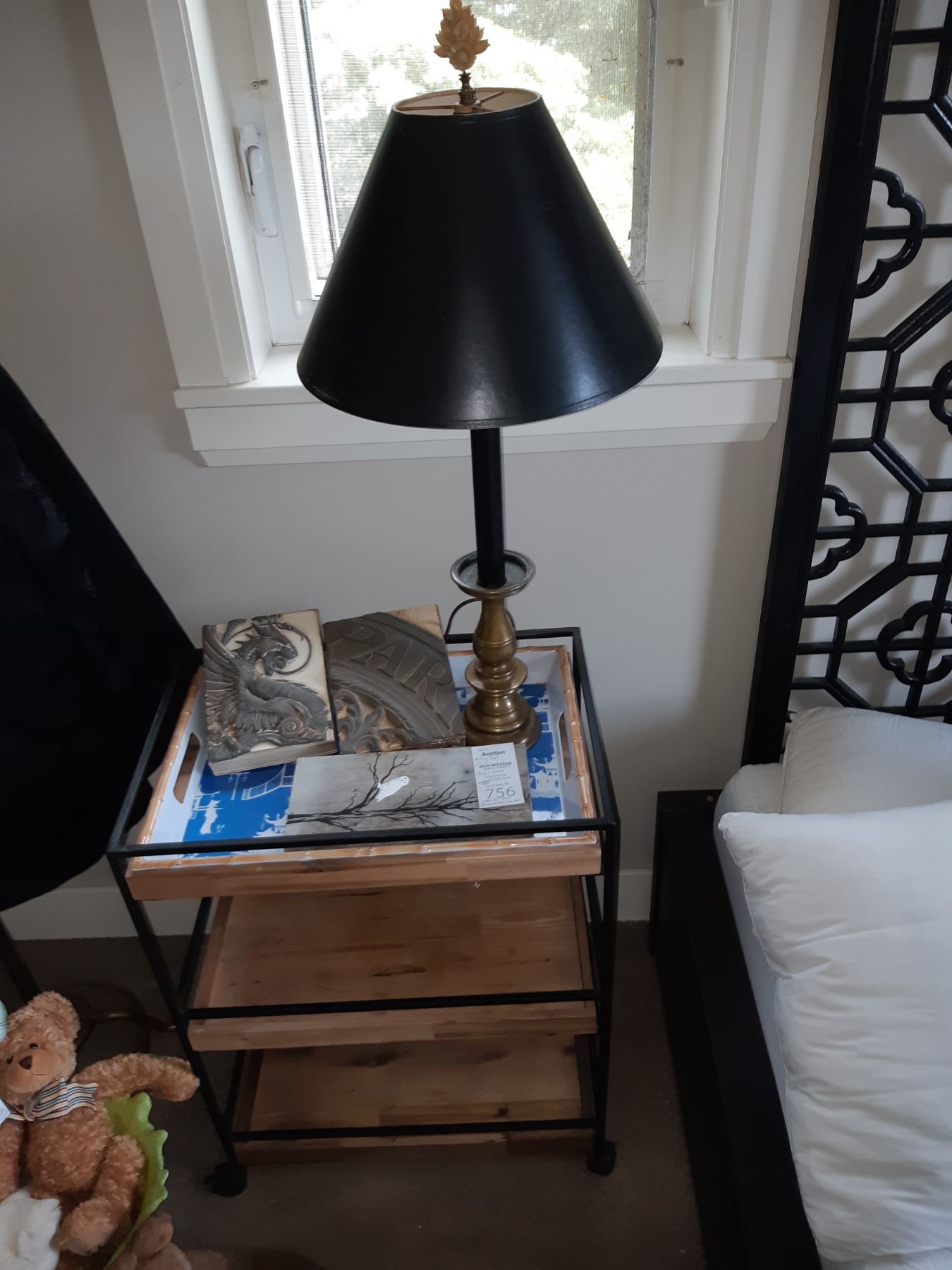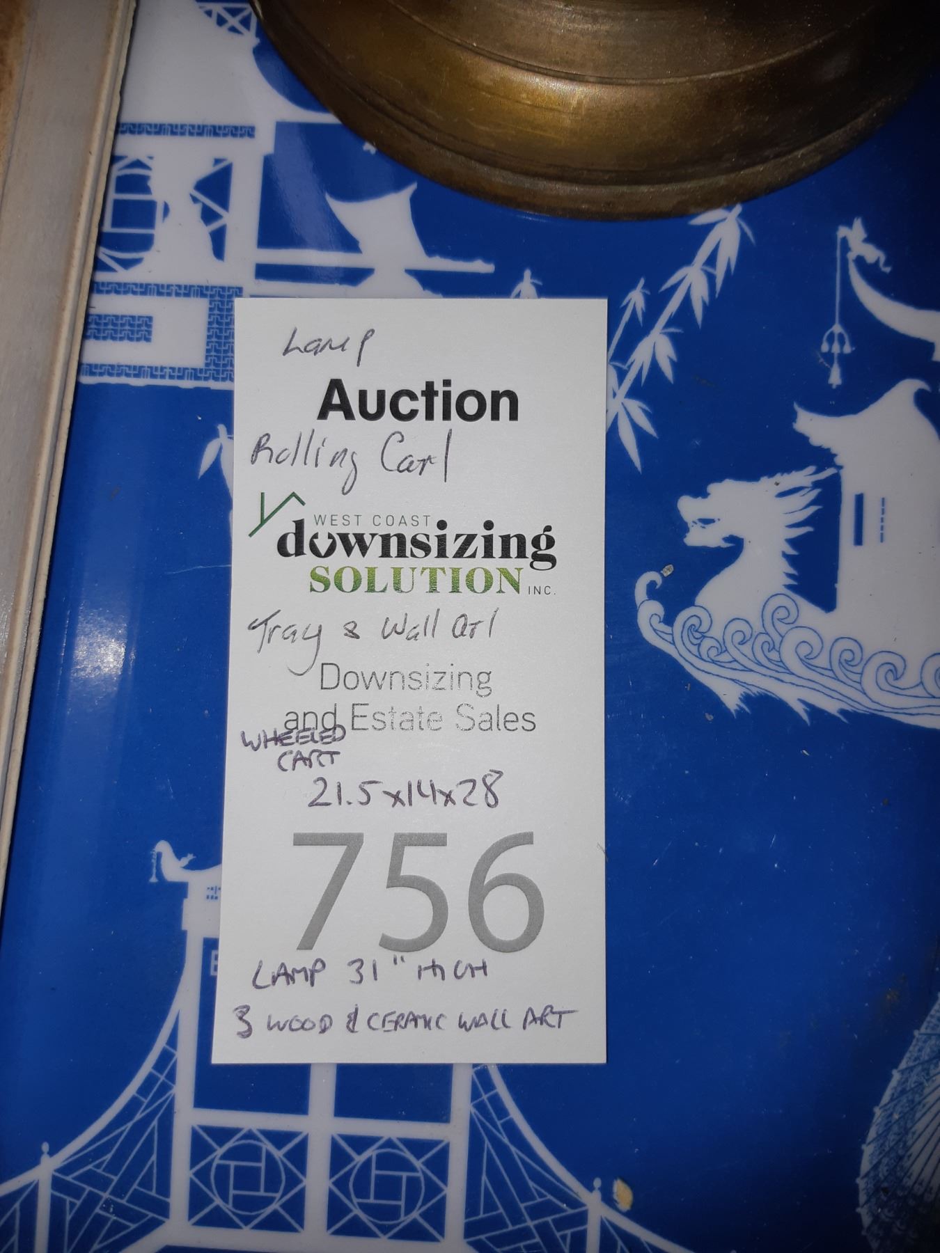 Rolling cart, 21x14x28, lamp 31 tall, wall art. Pickup 9am