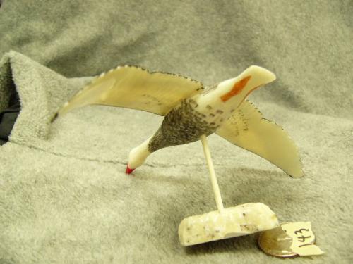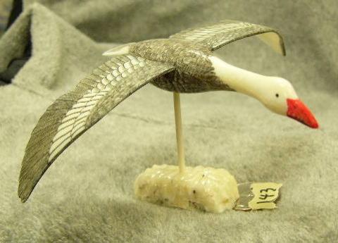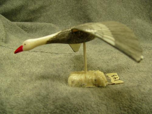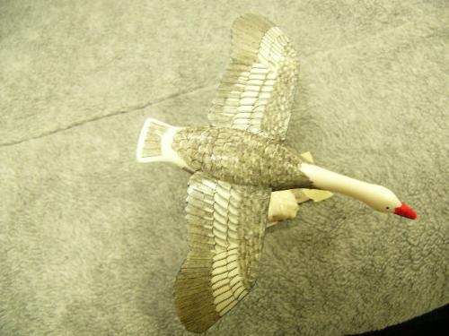 Carved ivory flying snow goose (blue phase) by C. Kokuluk - 2-1/4" tall, 4-1/8" from tail feathers to bill, approx. 5-1/4" from wing tip to wing tip