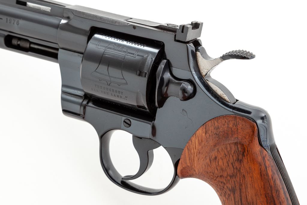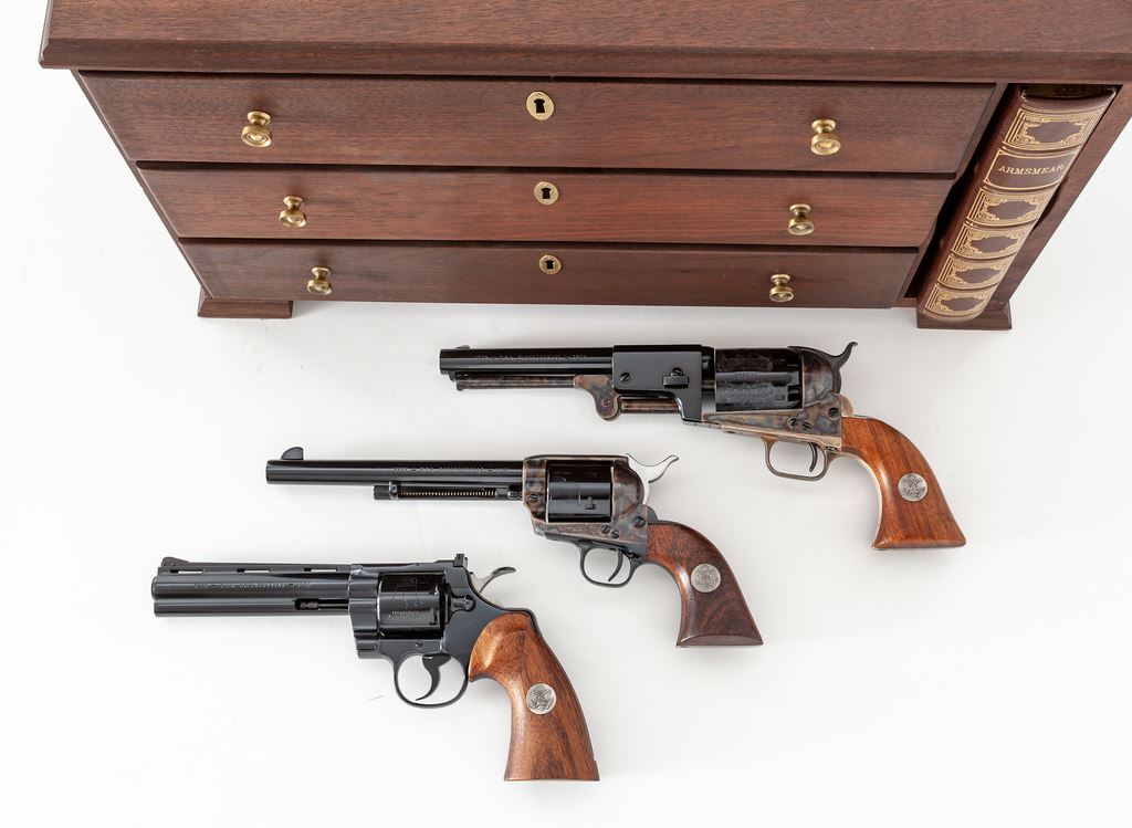 Cased Colt Three-Gun Bicentennial Set, containing three revolvers: Colt 2nd Gen. 3rd Model Dragoon, .44 cal. perc.; Colt Single Action Army Revolver, .45 cal.; and a Colt Python Double Action Revolver, .357 mag. cal., contained in a three-drawer red velvet-lined walnut display case. Each revolver is marked with the ''1776 - Bicentennial - 1976'' logo and features a ''Great Seal of the United States'' medallion inset into right side of each grip, along with patriotic scenes to each cylinder and matching serial numbers. 1.) Colt 2nd Gen. 3rd Model Dragoon, #0703DG, .44 perc. cal., 7'' barrel, royal blue and case colored finish, silver-plated backstrap and triggerguard, with smooth rosewood grips, and includes all accessories. Backstrap and triggerguard have tarnished. 2.) Colt Single Action Army, #0703PM, ,45 cal., 7.5'' barrel, royal blue and case colored finish, in excellent condition. 3.) Colt Python, #0703PY, .357 mag. cal., 6'' barrel, full royal blue finish, special unfluted cylinder, smooth rosewood grips, with one small scratch to right side of frame. Also includes a leather-bound special edition book entitled ''Armsmear''. Approx. 1776 produced in 1976 to commemorate the 200th anniversary of the USA. Est.: $3,000-$5,000/set. (Modern)(Sierra Sid's Casino, Sparks, NV.)