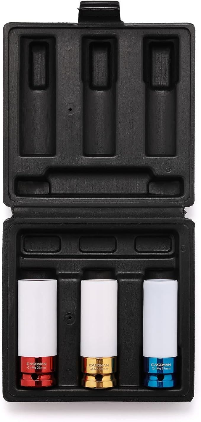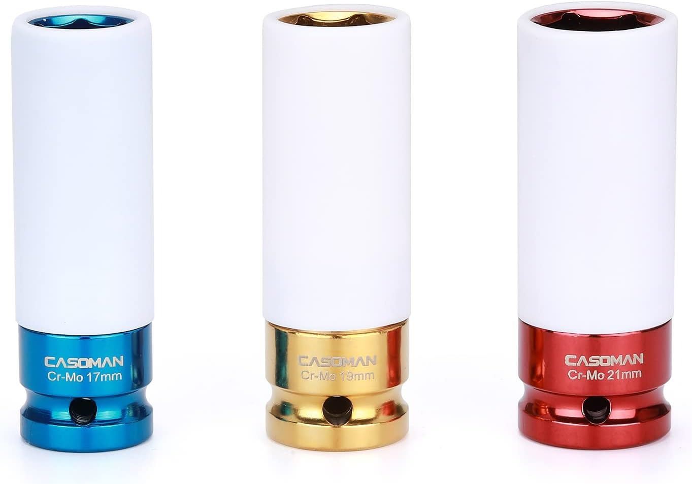casoman 1/2- inch drive wheel protector impact socket, 1/2" thin wall deep impact socket set plastic sleeve lug nut, 3 pieces set, 6 point, metric,cr-mo,17mm,19mm,21mm