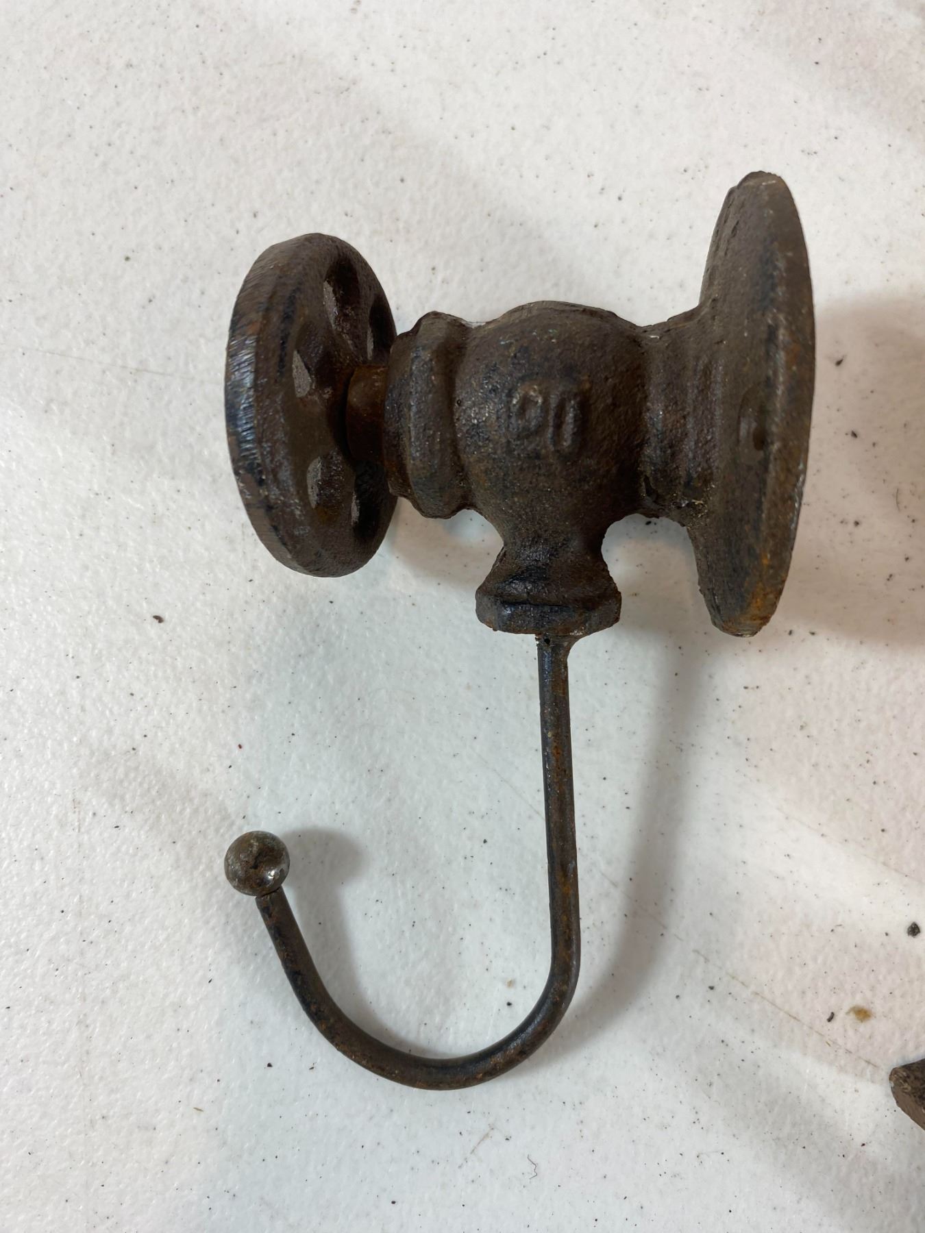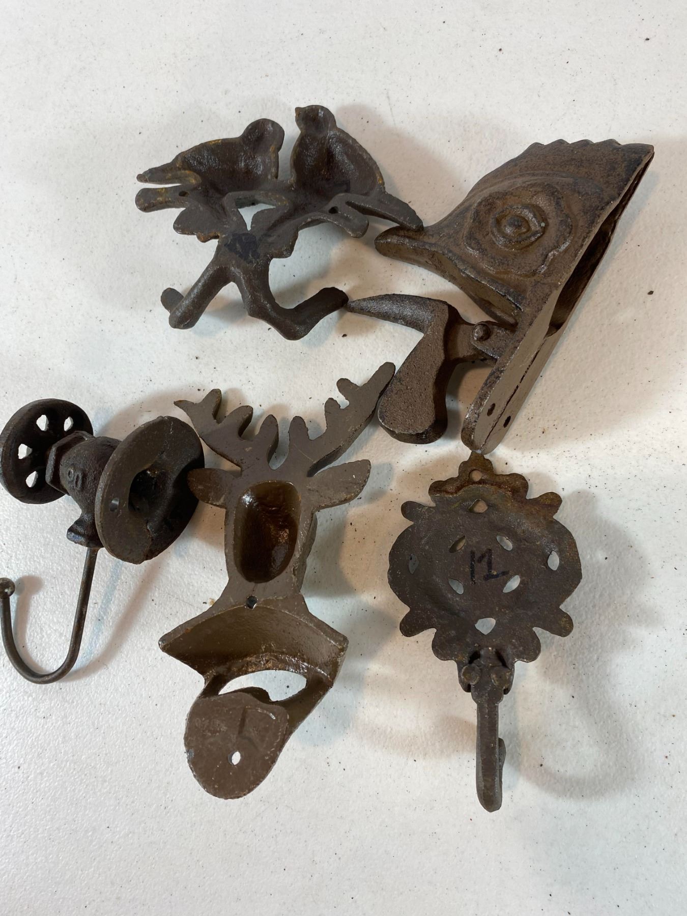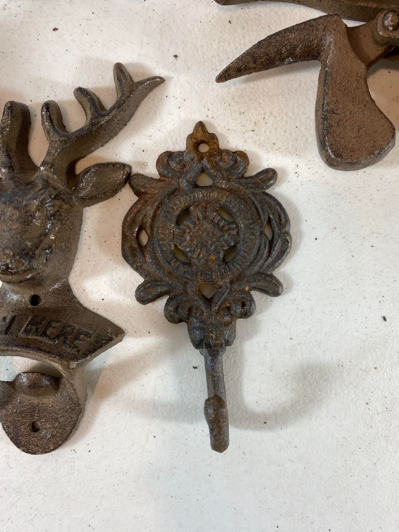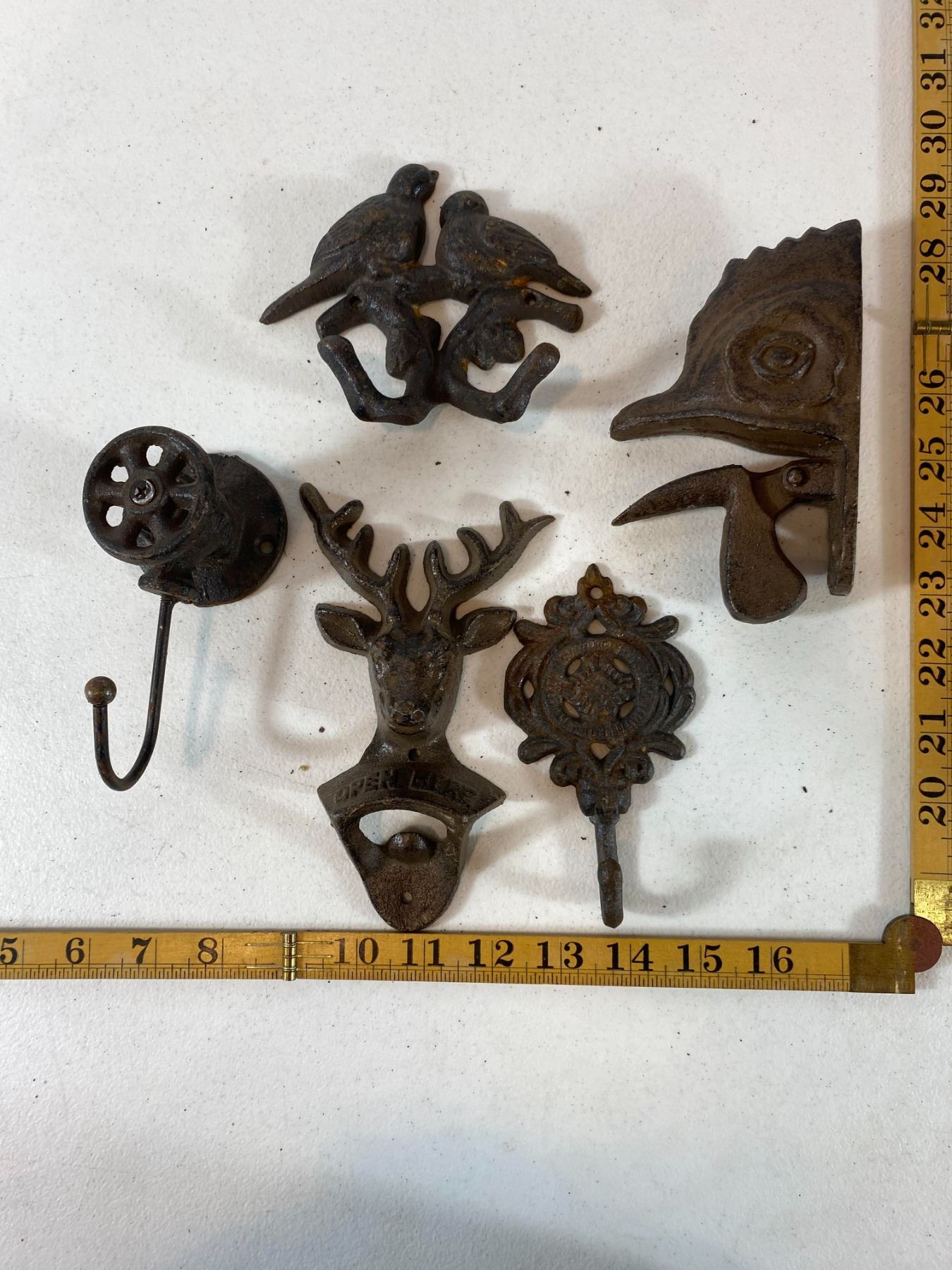 Assorted cast iron decor including rooster bottle opener, floral hook, bird pair wall piece, deer head hook and pulley-style hook. Pieces show surface rust and wear. All are modern reproductions in cast-iron style and offered as decorative collectibles.