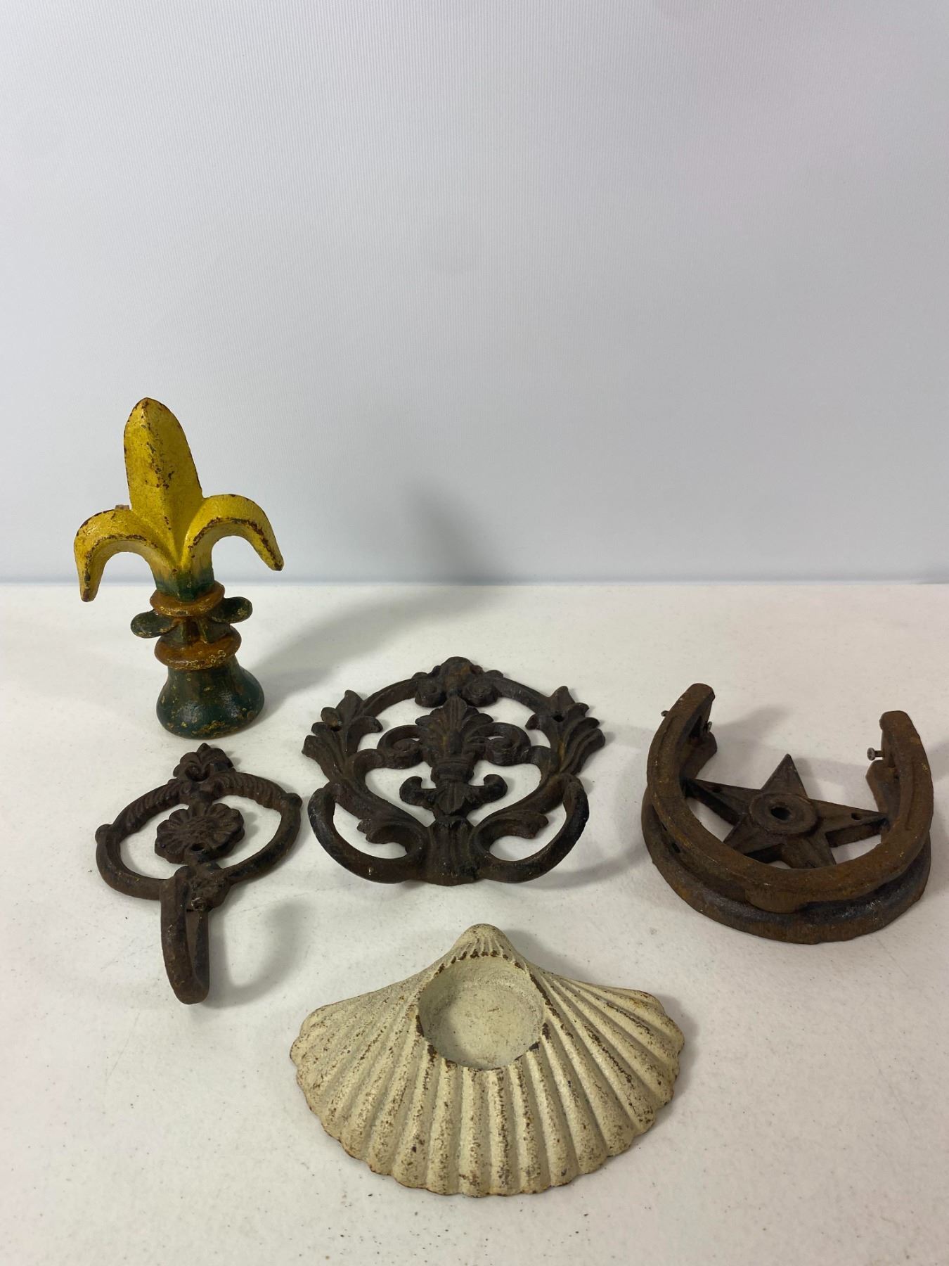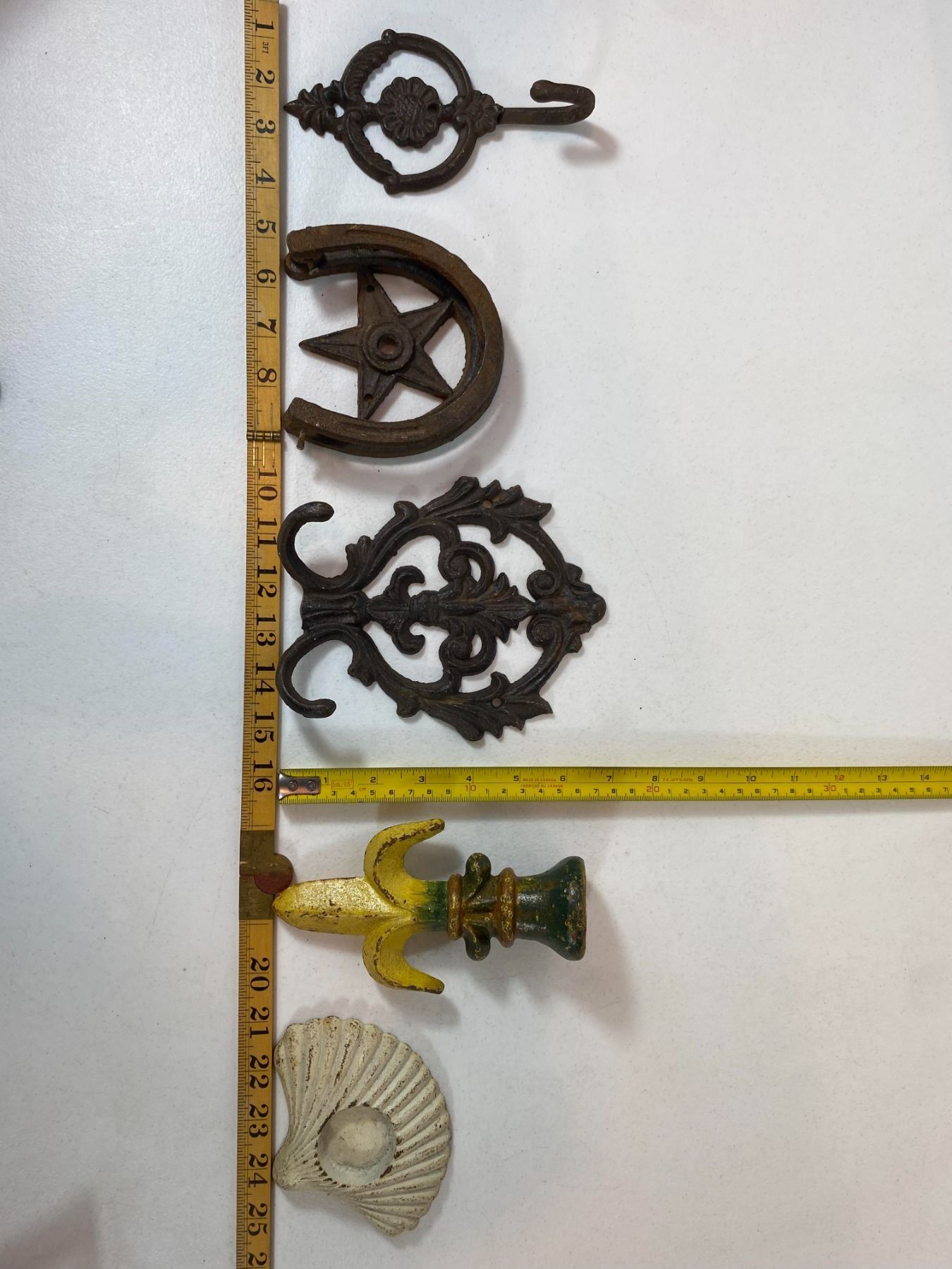Grouping of decorative cast iron including fleur-de-lis finial, shell-form dish, horseshoe star emblem, and wall hooks. - Ornate green hook, shell dish, painted finial - Horseshoe with star insert - Age-consistent rust and patina