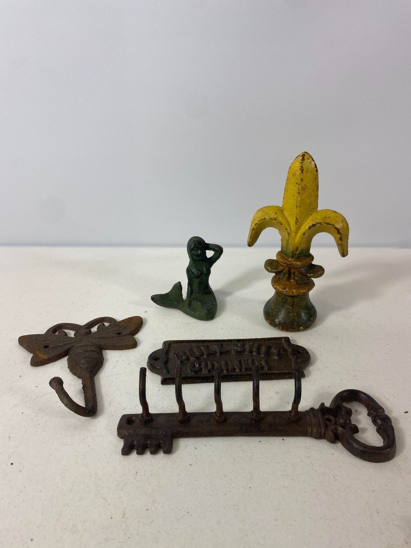 Cast Iron Decorative Lot: Mermaid Figure, Fleur-de-Lis, Dragonfly Hook and Key Rack