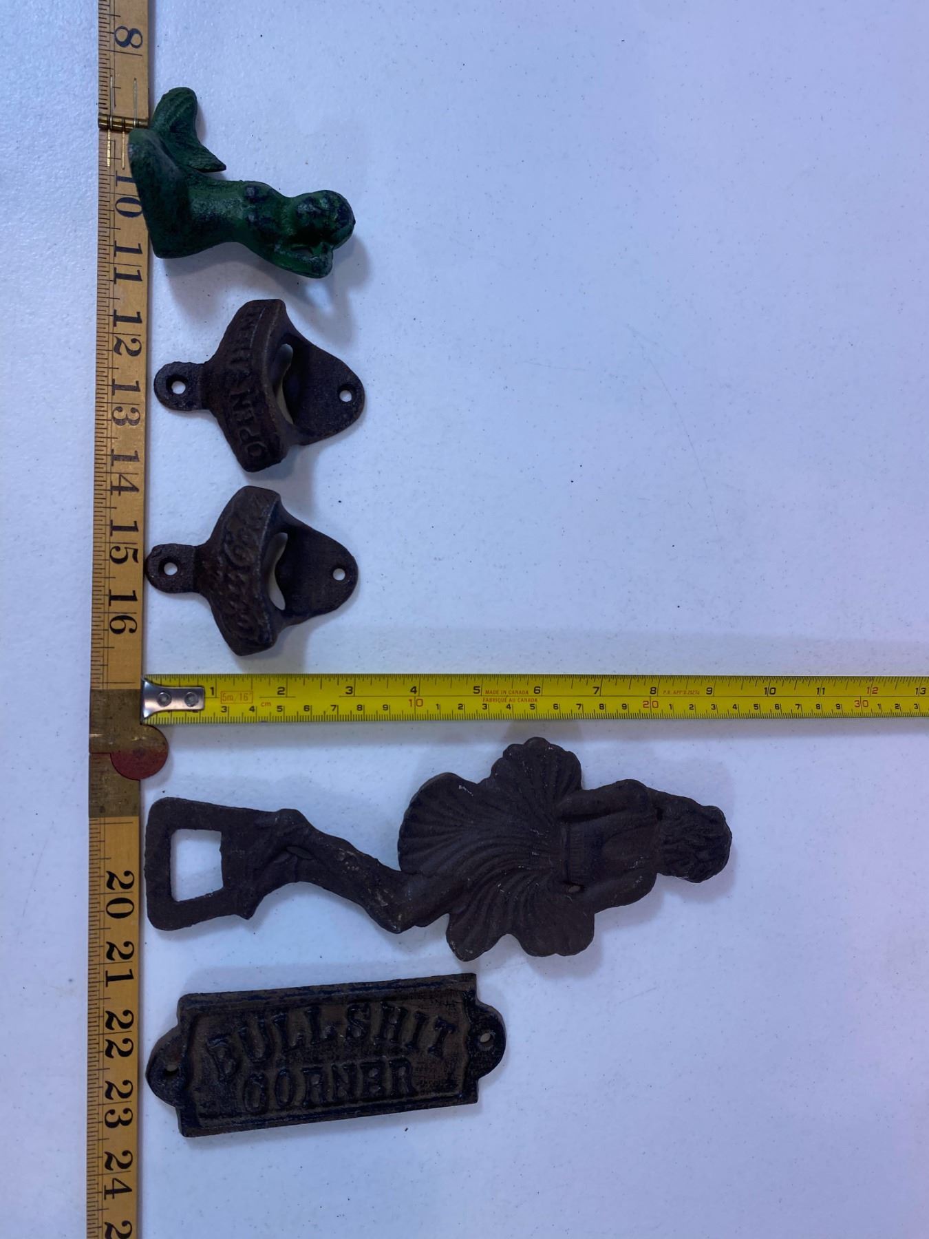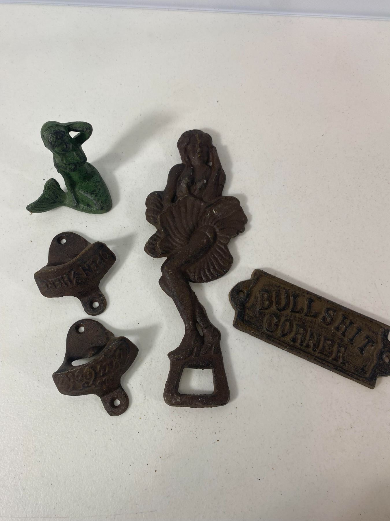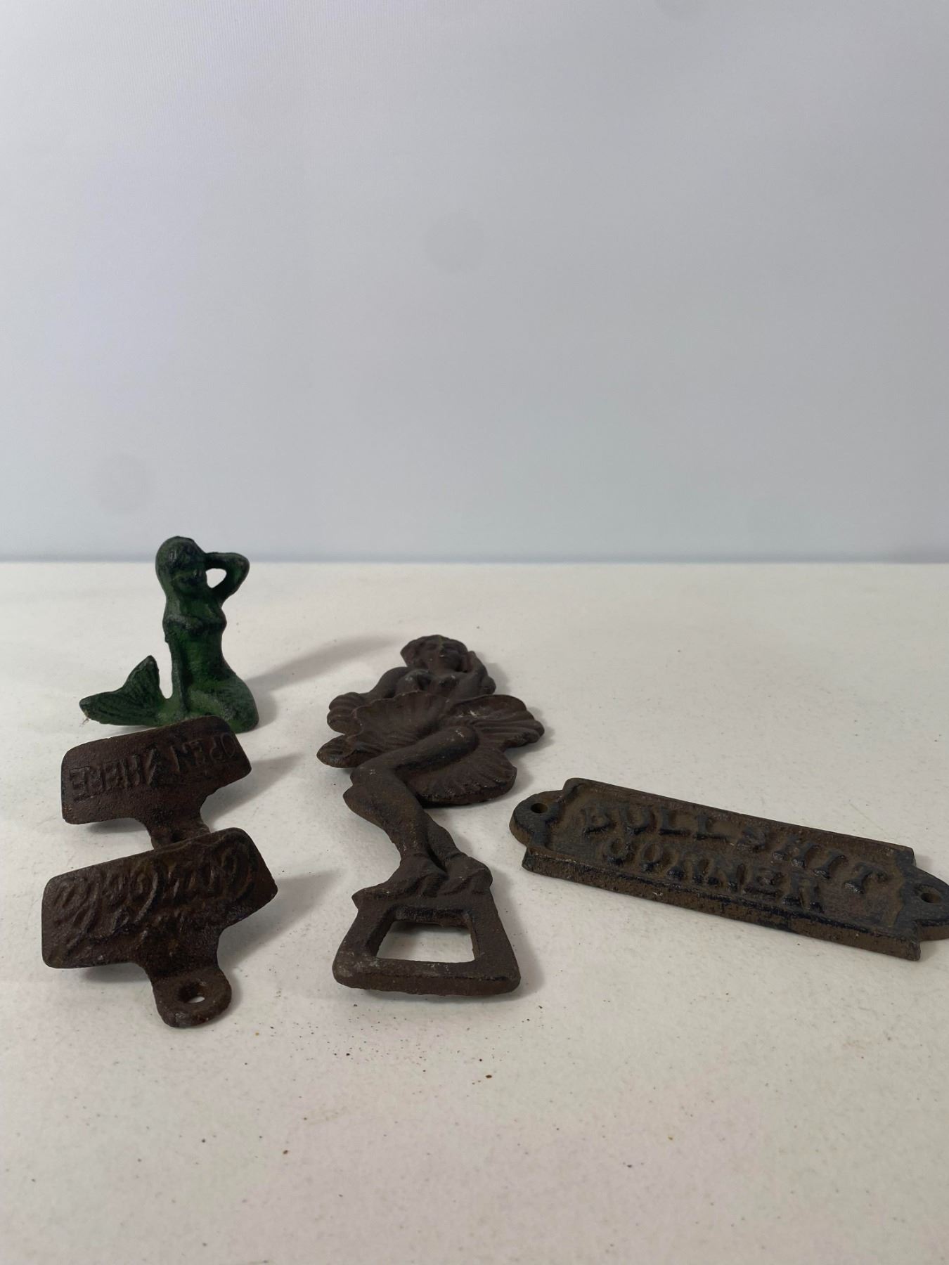 A selection of cast iron nautical and novelty decor including mermaids and bottle openers. - Two mermaid figures, two bottle openers - Large mermaid opener and 'Bullshit Corner' plaque - Age wear and patina present
