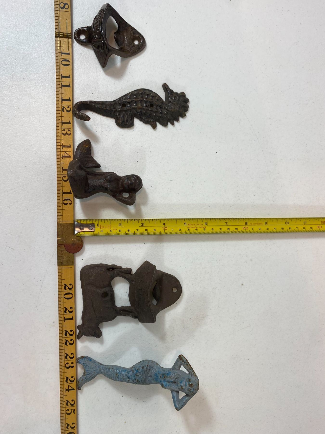 Nautical-themed cast iron decor including mermaids, seahorse hook, and openers. - Two mermaids, cow opener, ornate opener - Seahorse wall hook included - Rust and wear consistent with cast iron