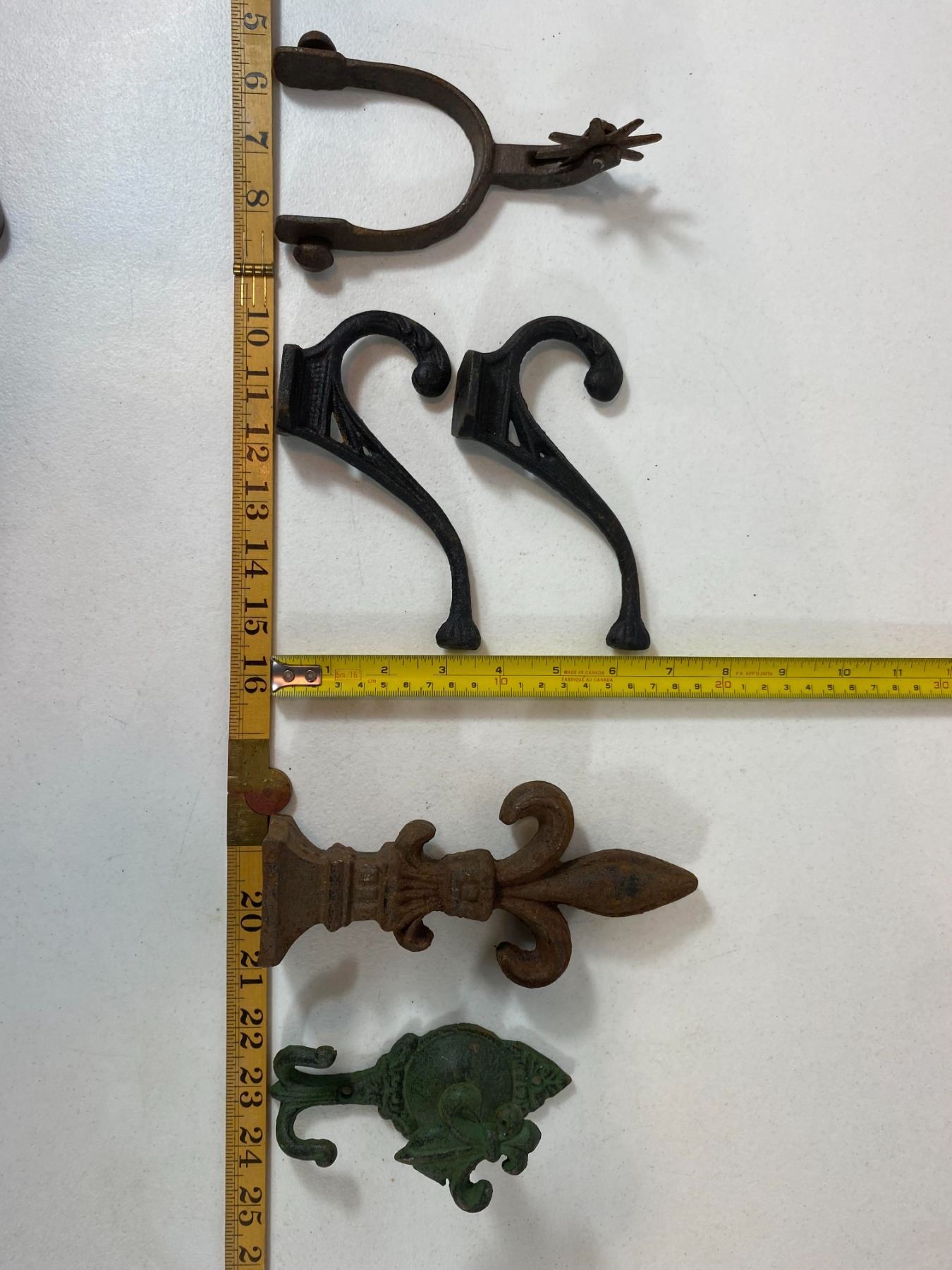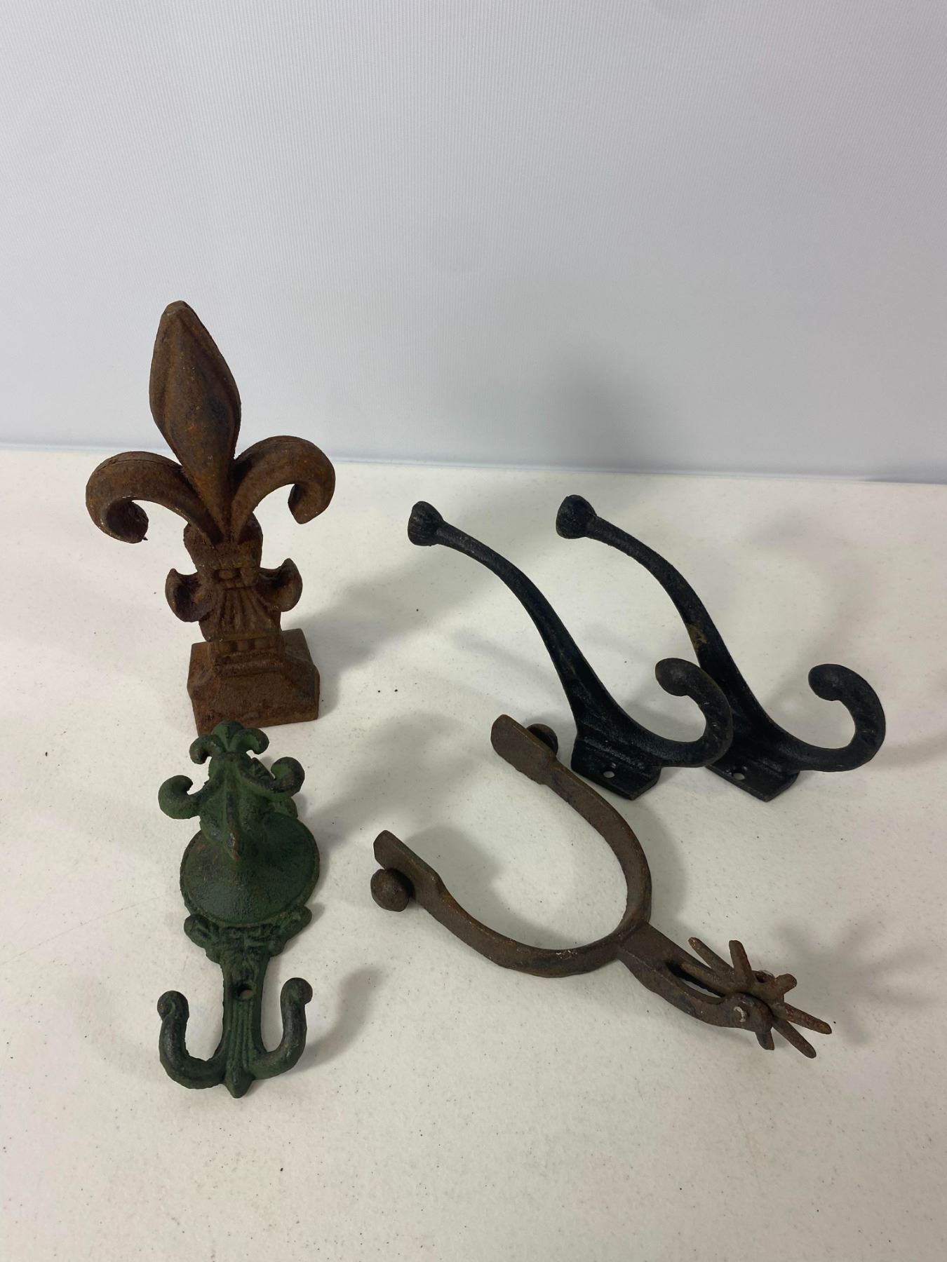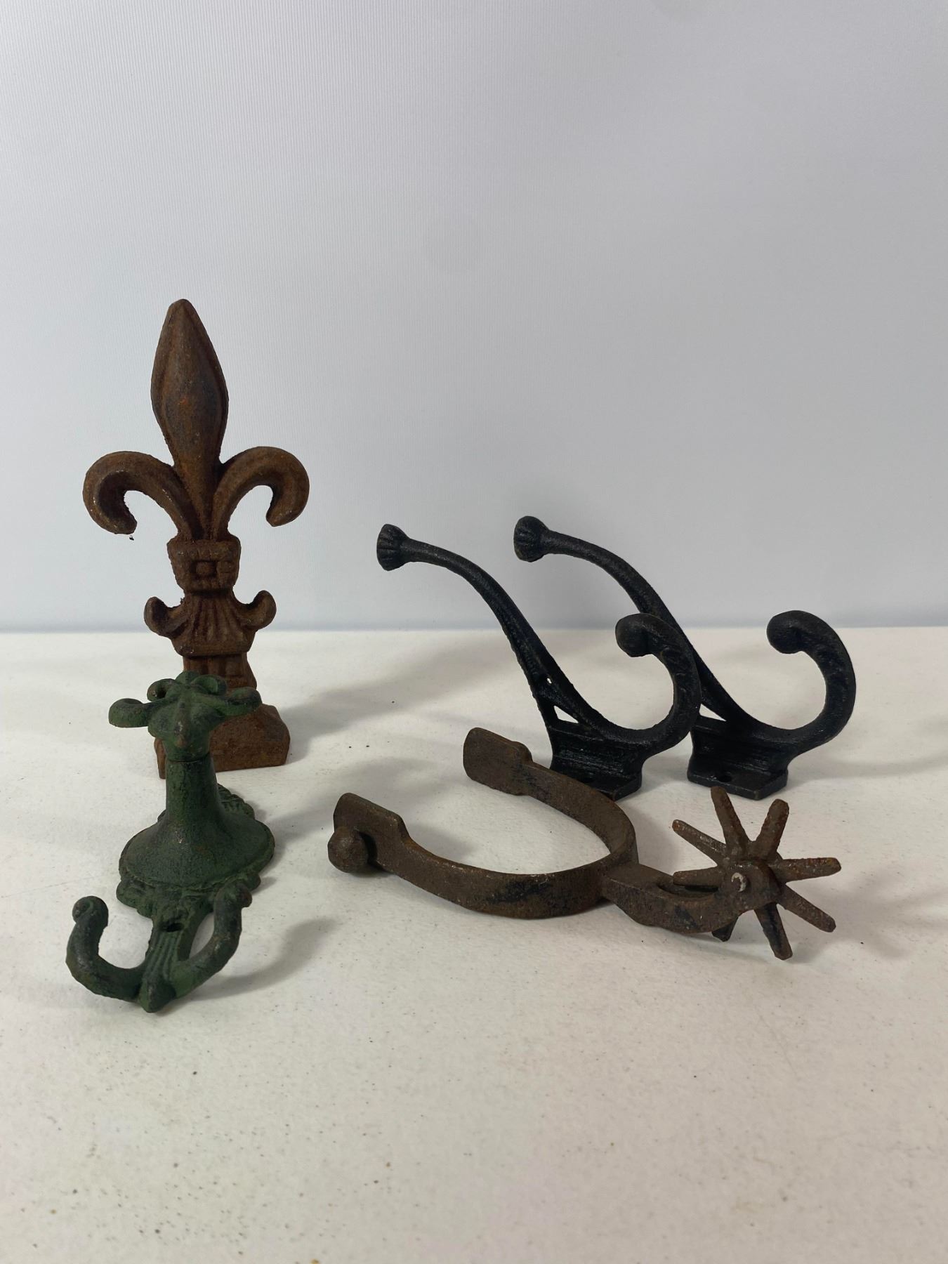 Western-themed cast iron items including spurs, hooks, and decorative finial. - Pair of cast iron spurs - Matching ornate hooks and fleur-de-lis finial - Surface rust and age wear consistent with use